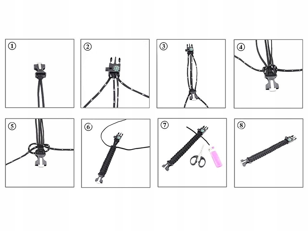 Браслет виготовлений з міцного матеріалу і містить мотузку, ніж, компас, свисток і запал. Все застібається на міцну пряжку. Крім того, він служить стильною прикрасою, яку носять на руці.