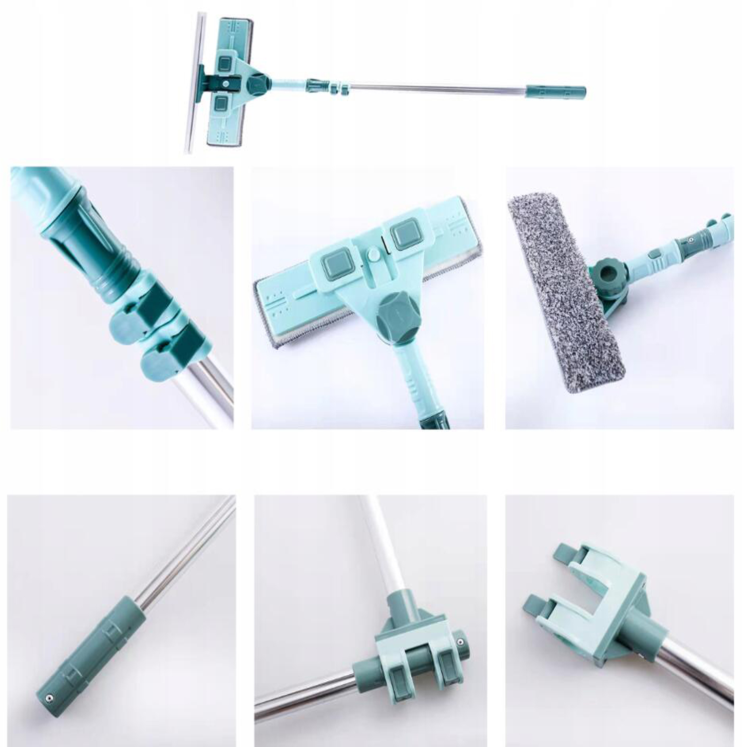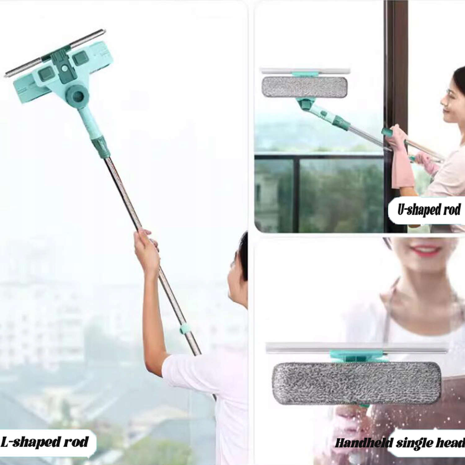 , оснащена ручкою, укладеною U, може бути використана для витерення зовнішніх поверхонь вікон без необхідності стояти на високих сходах або в небезпечних місцях. Завдяки телескопічному стрижню, який може вільно поширюватися на 1,45 см, він використовує принцип важелів для збереження зусиль та забезпечення підтримки легкого очищення вікон на різних висотах та важких для досягнення місць.