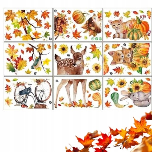 ⭐ Наклейки з осіннього вікон - 9 аркушів тварин, листя, гарбузи, осінні прикраси ⭐