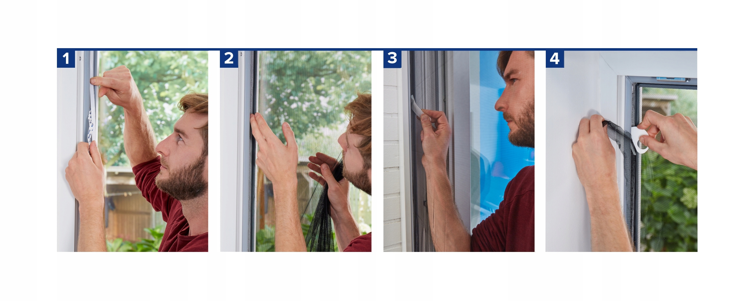 - Завдяки інноваційній системі «Easy-on» із клейкою стрічкою Velcro, встановлення москітної сітки стає простим і легким. b> Просто приклейте стрічку до дверної рами, а потім прикріпіть сітку за допомогою липучки. Крім того, система «Easy-off» дозволяє легко зняти москітну сітку не залишаючи слідів клею.