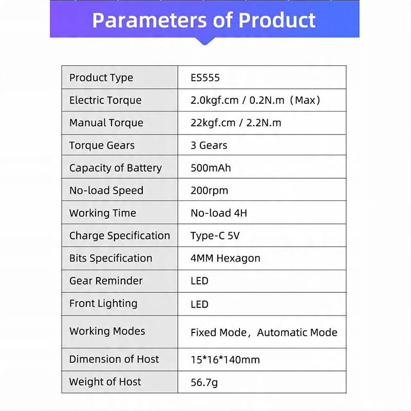 - Контроль крутного моменту: три регульовані передачі крутного моменту (до 2,0 кгс.см електричного та 22 кгс.см ручного крутного моменту) відповідають різноманітним додаткам від легких завдань до важкого ремонту.