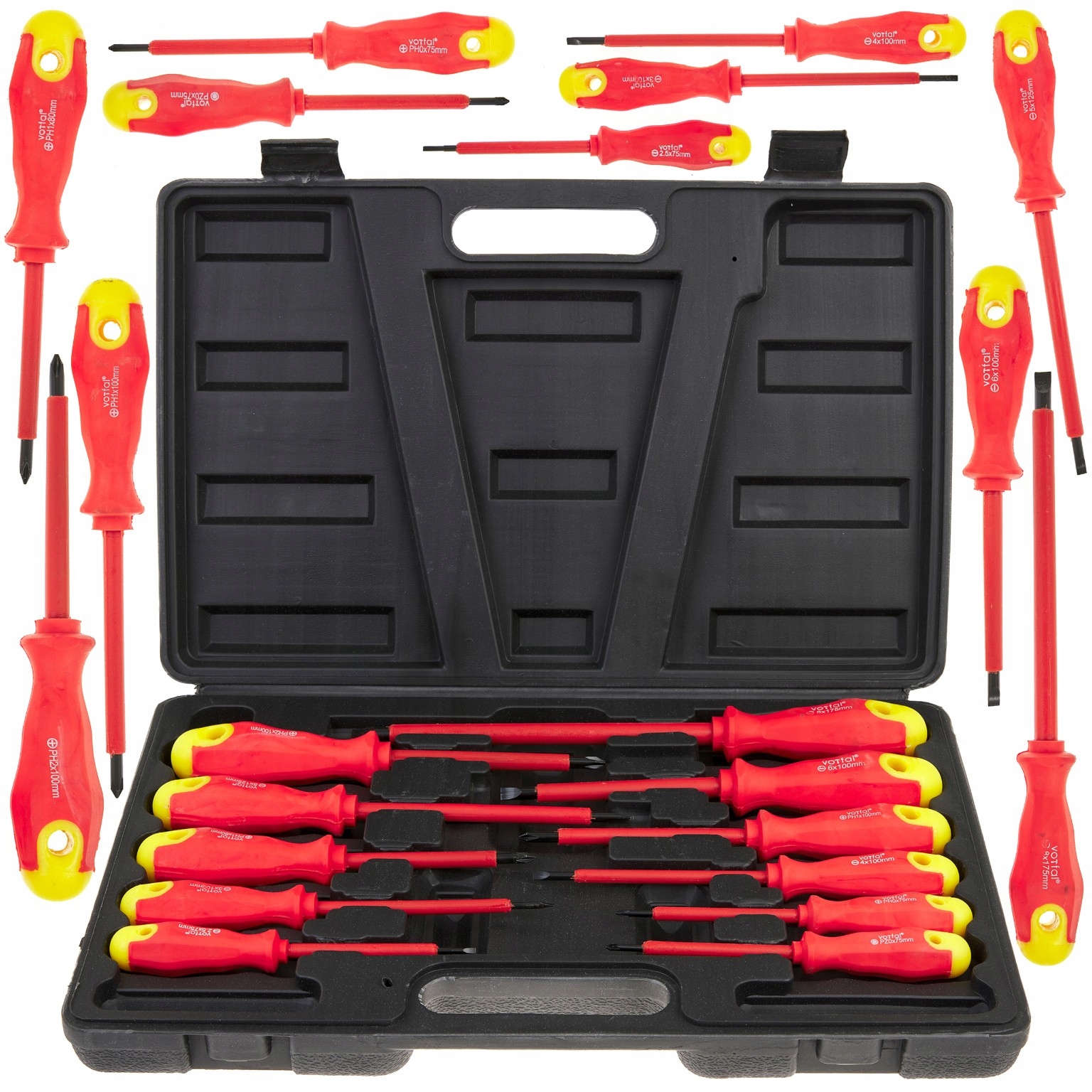 - Спеціалізовані викрутки, ізольовані для роботи з високою напругою. Викрутки були виготовлені з високоякісної хромованої сталі, сильно ізоляційного матеріалу та загартованого наконечника. безпека. Набір з 11 викруток забезпечує можливість обробки більшості популярних розмірів гвинтів та гвинтів.