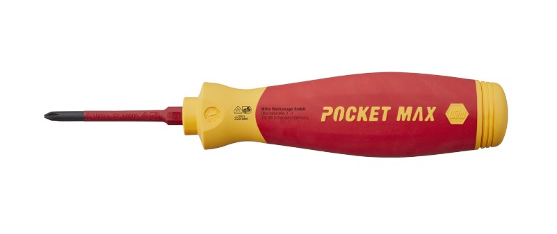 Компактний і легкий інструмент PocketMax® від Wiha легко поміщається в кишеню будь-якої сорочки чи штанів і є ідеальним компаньйоном для кожного електрика. Магазин для біт, надійно захований у ручці, вміщує чотири slimBit.