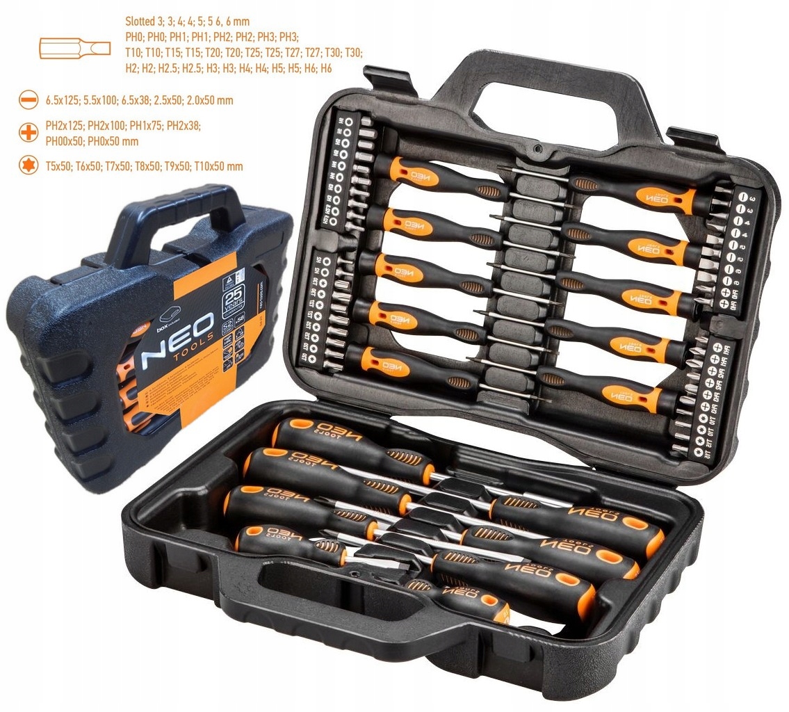 Набір викруток і насадок NEO містить 58 високоякісних елементів. Наконечник кожної викрутки виготовлений з дуже міцної сталі S2, що забезпечує тривалий термін служби. Викрутки мають магнітний наконечник. Трикутна форма ручки з профільованим упором для великого пальця знижує навантаження на руку під час роботи та сприяє отриманню оптимального крутного моменту. Двоматеріальна ручка запобігає ковзанню в руці та стійка до хімікатів, масел і жирів. Якість інструменту підтверджено 25-річною гарантією від виробника. Усе це, разом із 10 високоякісними точними викрутками та 40 бітами різних форм і розмірів, вкладено у зручну валізу для зручного транспортування та зберігання. Торгова марка NEO відповідає очікуванням професіоналів.