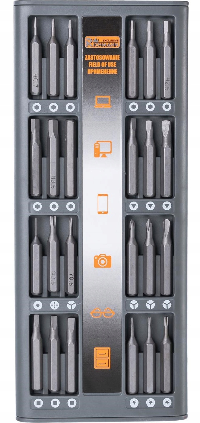 - Покрутка з взаємозамінними порадами сталі S2. Розроблений для ремонту, серед інших: Телефони, планшети, навігація, камери, ноутбуки та всі інші пристрої, де підрахунок точності. Під час транспортування. PH000, pH00, pH0, pH0, ph1