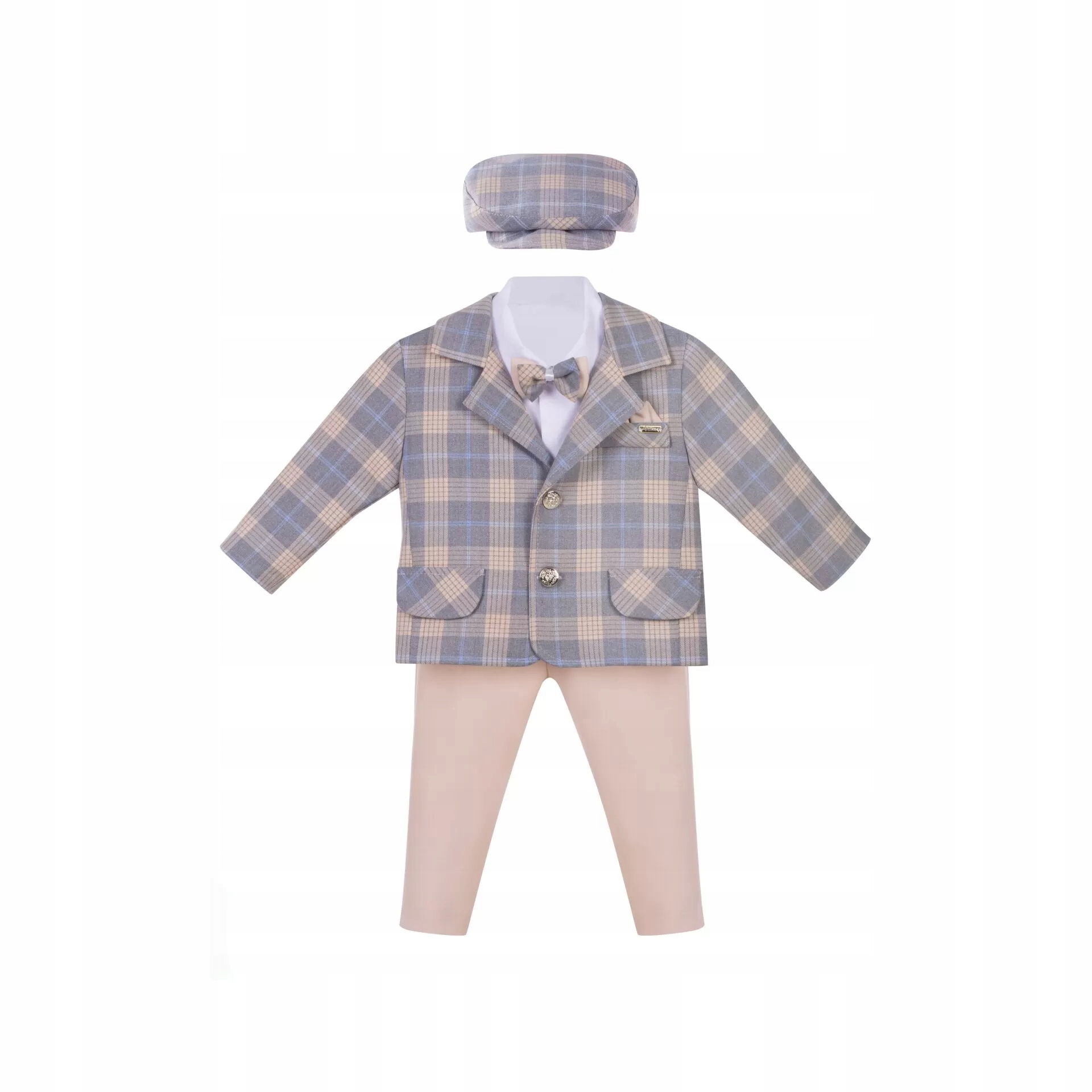 надзвичайно елегантний костюмчик для хрещення хлопчика, виготовлений з матеріалів найкращої якості. Набір для хрещення з 5 предметів, який пропонує наш магазин дитячого одягу, відрізняється надзвичайною увагою до деталей. Золотий картатий костюм на хрещення хлопчика складається з наступних елементів: