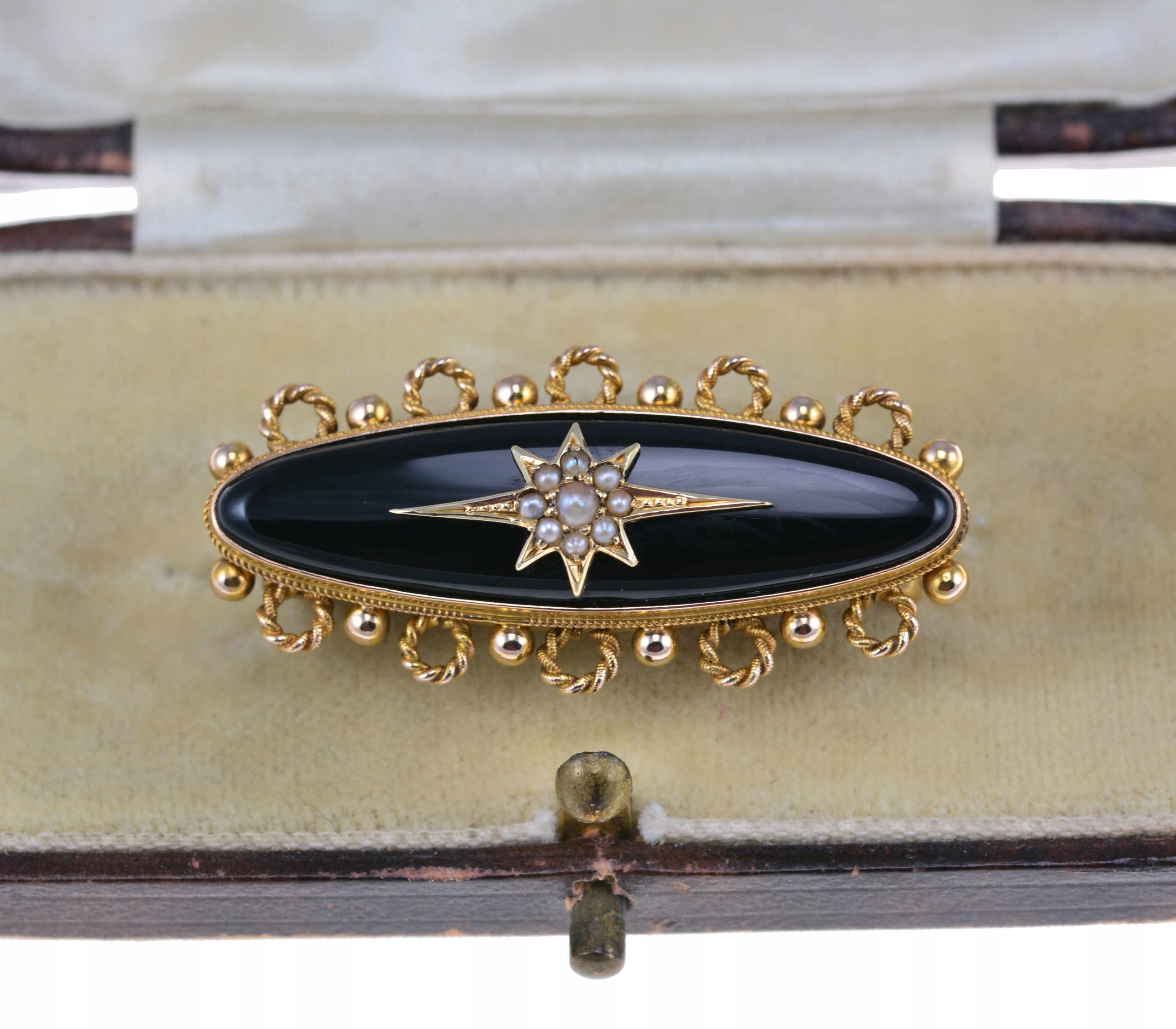 Предмет продажу вікторіанська брошка із золота 15К, сплав типовий ювелірних виробів початку 20 ст. Брошка, оздоблена оніксом, посередині золота аплікація у формі зірки, прикрашена річковими перлами – ще один типовий ювелірний мотив вікторіанської епохи. На звороті — секретер зі скляним віконцем. Булавка виготовлена з металу. Дуже хороший стан.