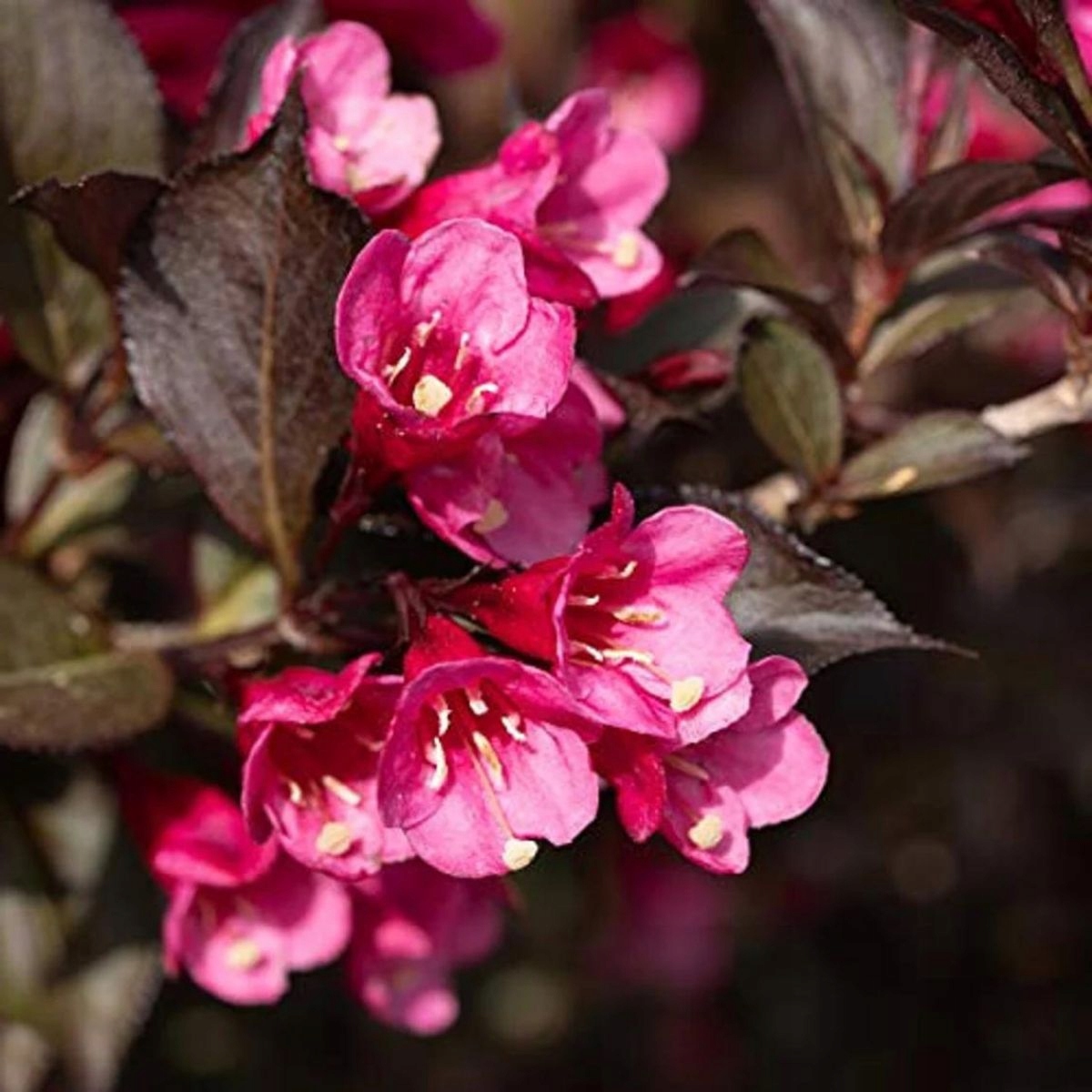 Коричнево-червоне листя, квітки пурпурно-червоні зовні, блідо-рожеві всередині, зібрані по кілька разом, у формі дзвоника, з’являються з червня по вересень.