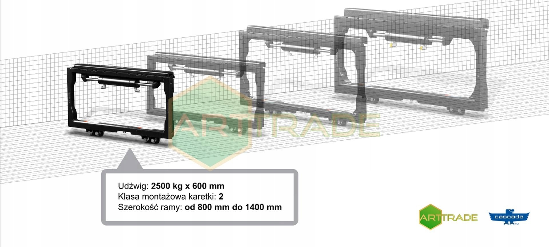 - Бічні перемикачі CASCADE вантажопідйомністю 2500 кг, 3000 кг, 5000 кг і більше. Травелери з різною шириною рами, призначені для різних виробників навантажувачів