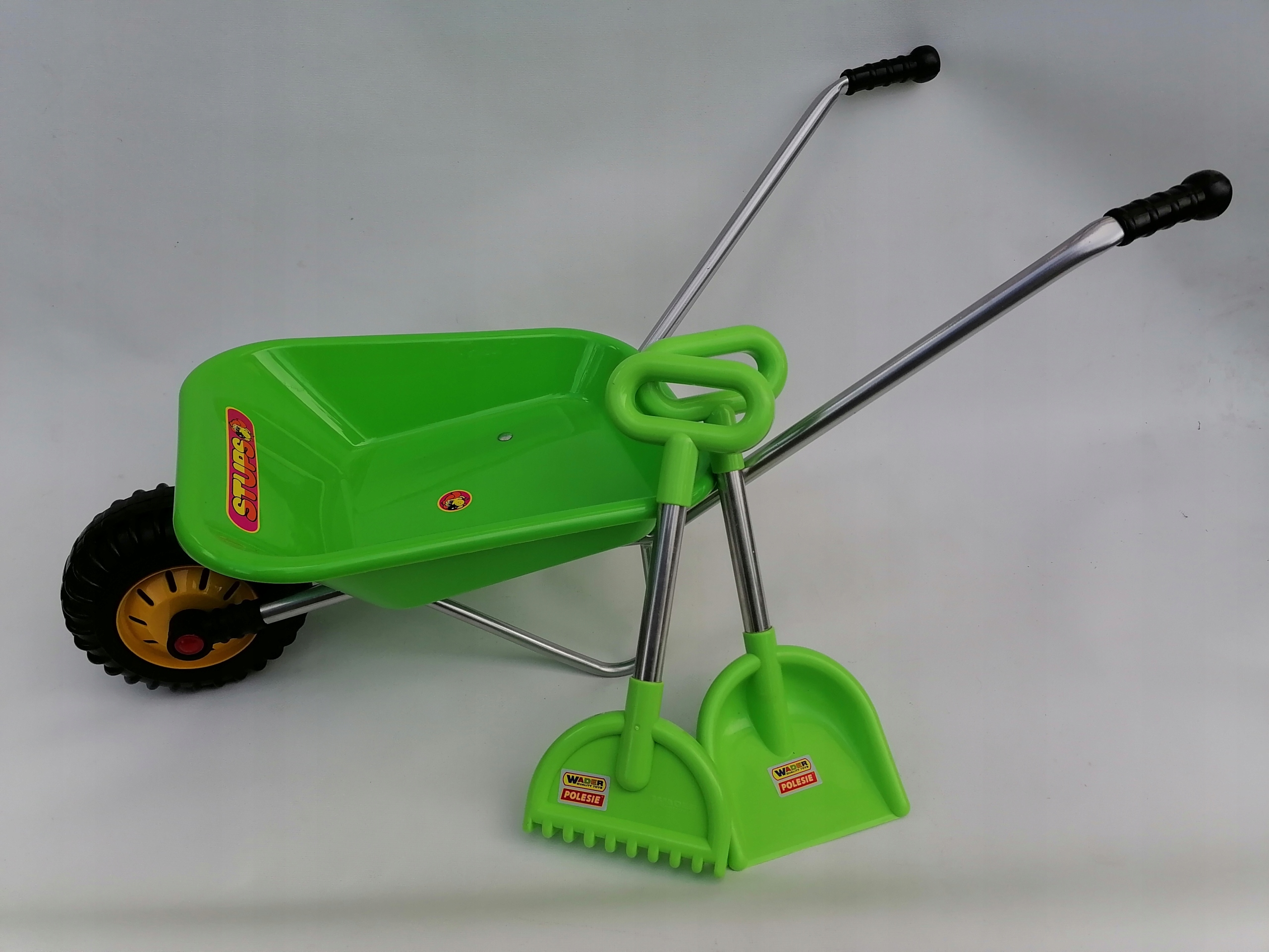 композиція набору: дитячі тачки (з металевими елементами) + інструменти (звичайний горіг і шовзель).