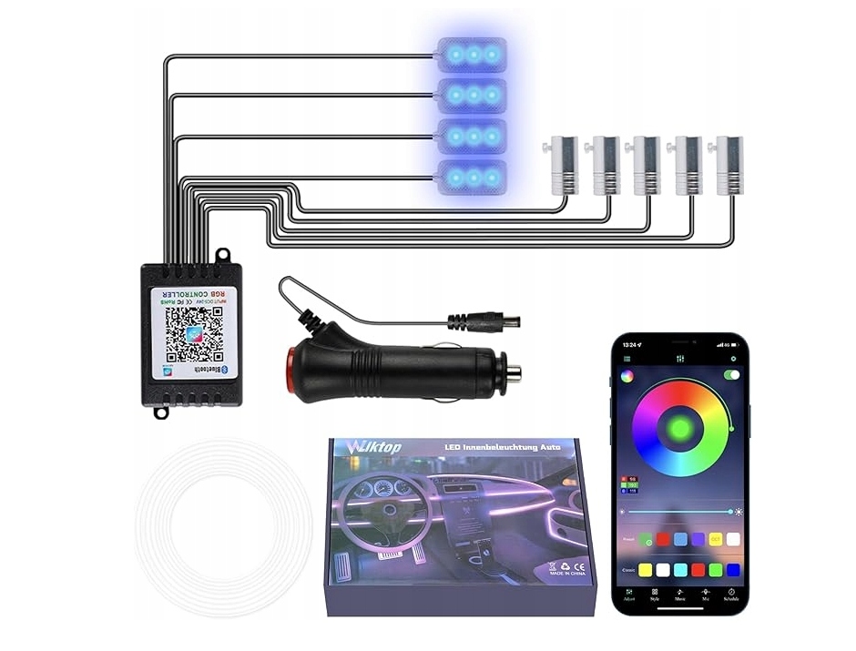 Вільктоп Світлодіодного освітлення внутрішнього інтер'єру - це чудове рішення для людей, які хочуть додати стиль та атмосферу інтер'єру свого автомобіля. Завдяки 9 фрагментів кольорових смуг RGB та функції освітлення ритму музики, кожна подорож стане унікальним досвідом! Особливості продукту
