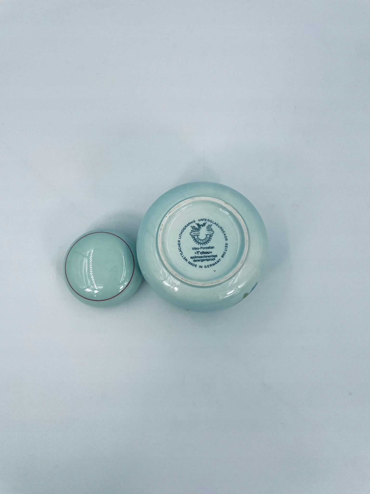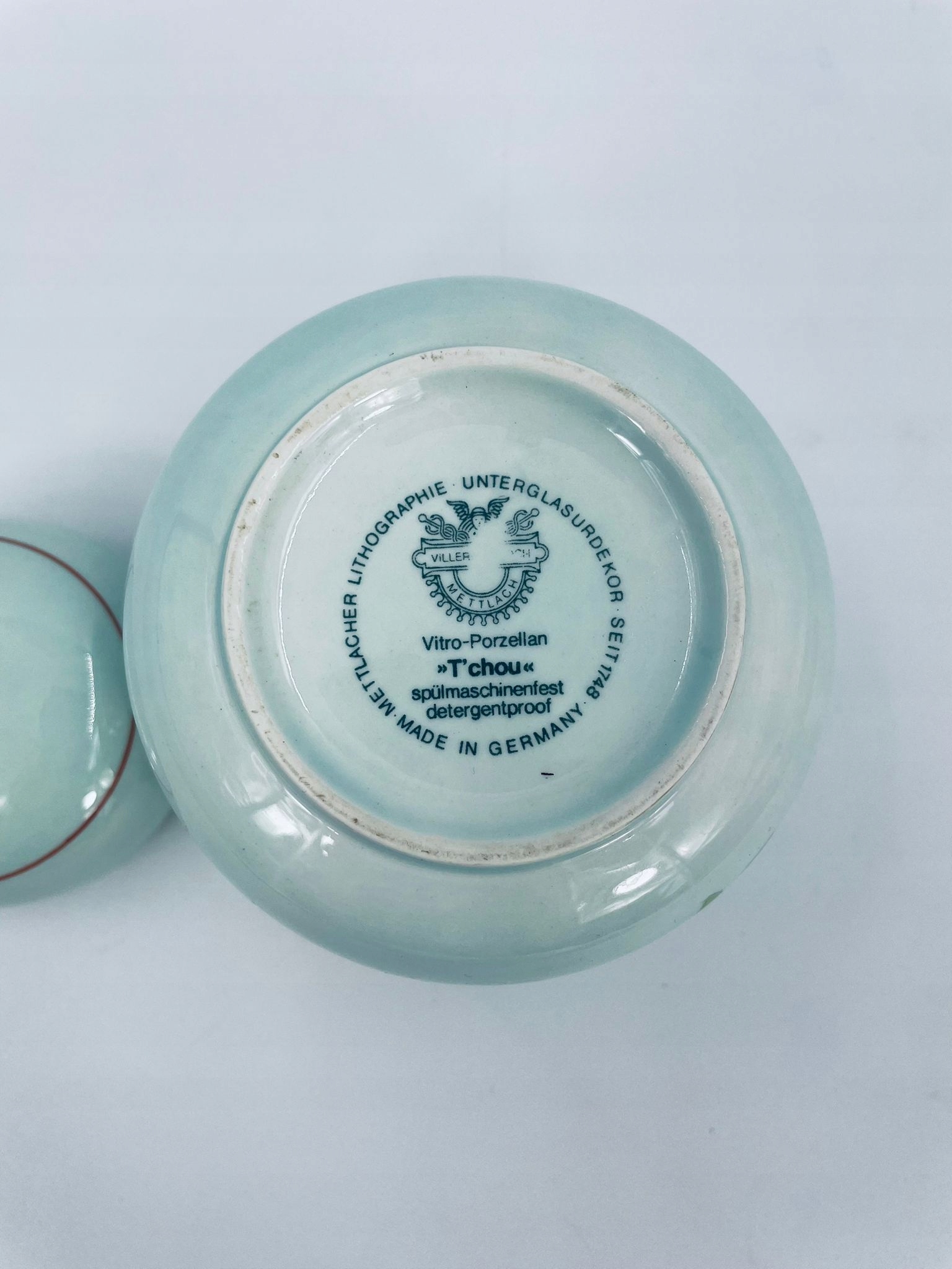 кондитерська знаменитої етикетки Віллерой Бох Маттлахер Літографія. T'Chou Confectioner - це візерунок, який характеризується яскраво -зеленим фоном та прикрасою червоного та жовтого хризантем із зеленим листям, закінченим тонким червоним поясом навколо краю та покриттям.