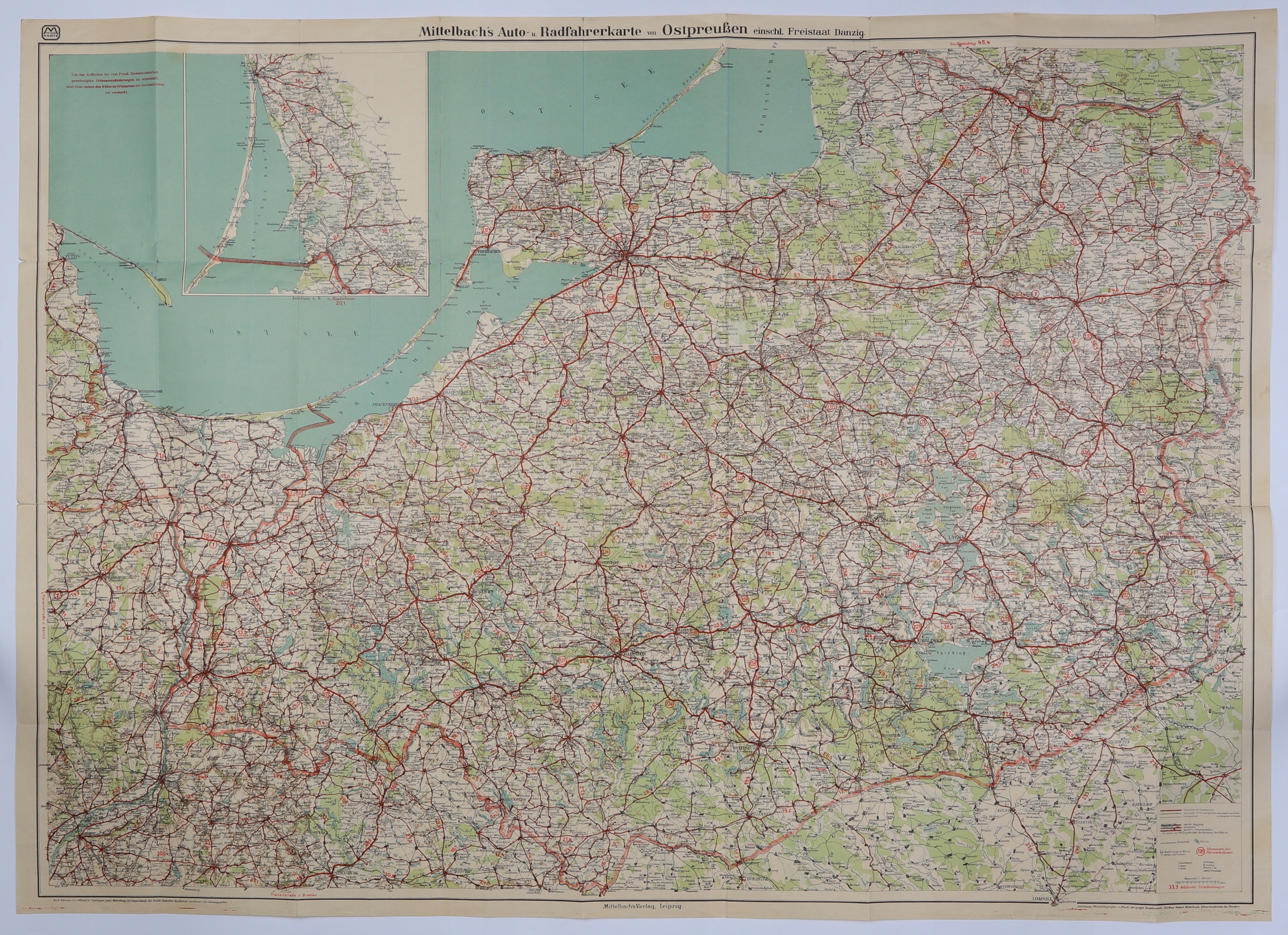 ВІЛЬНЕ МІСТО ГДАНСЬК - СХІДНА ПРУССІЯ. Карта, Mittelbach's Verlag, Leipzig до 1939 року; у верхньому лівому куті карта Клайпедської області; кольоровий друк, легенда; аркуш багатократно складений, незначні розриви і мінімальна перфорація в місцях згину; розмір аркуша в розгорнутому вигляді: прибл. 1095x785 мм.