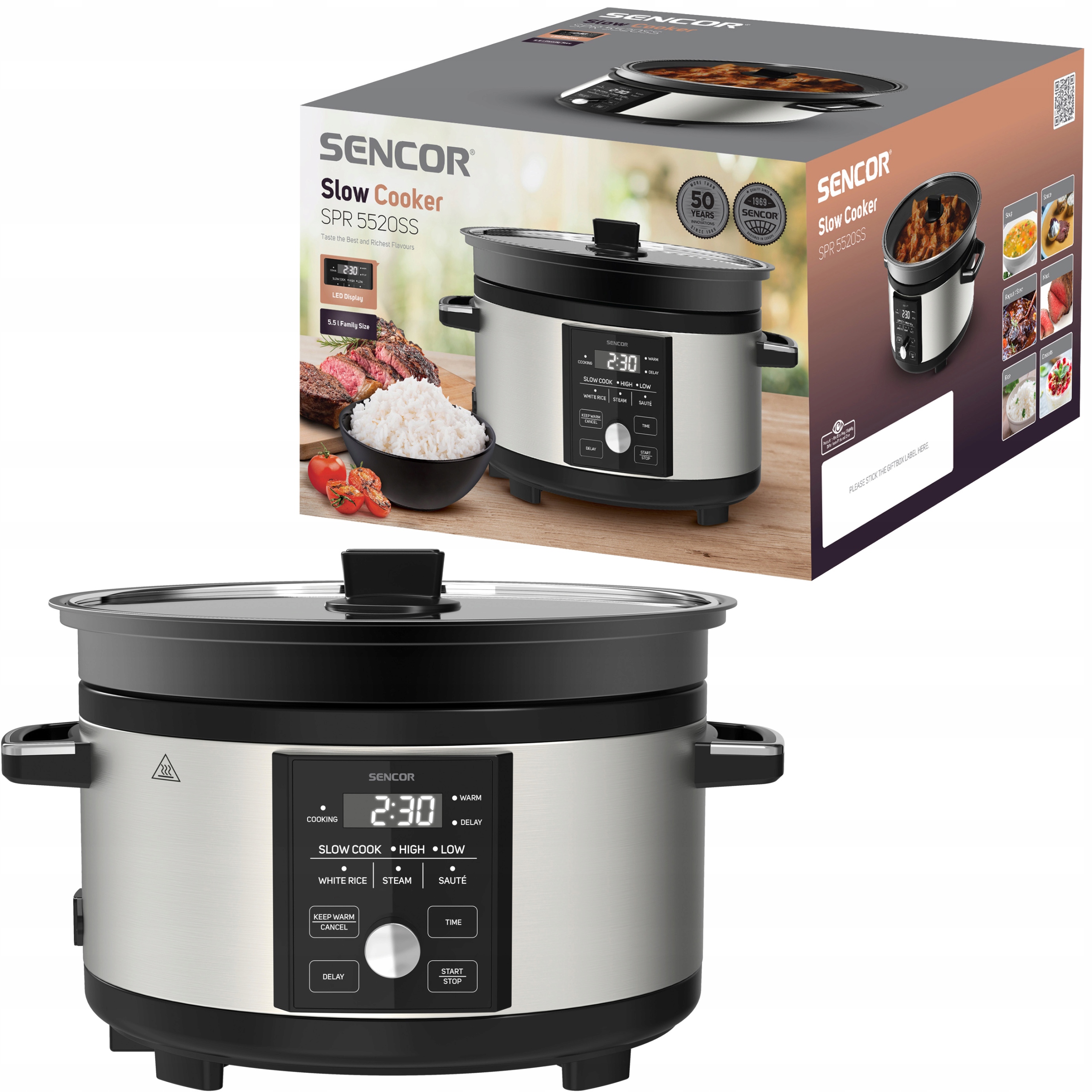 Sencor SPR5520SS – це сучасний багатофункціональний кухонний прилад, призначений для здорового, простого та економічного приготування їжі. Завдяки елегантному покриттю з нержавіючої сталі, інтуїтивно зрозумілому цифровому управлінню та широкому набору функцій ця мультиварка ідеально підходить як на домашній кухні, так і під час приготування їжі під час подорожі.