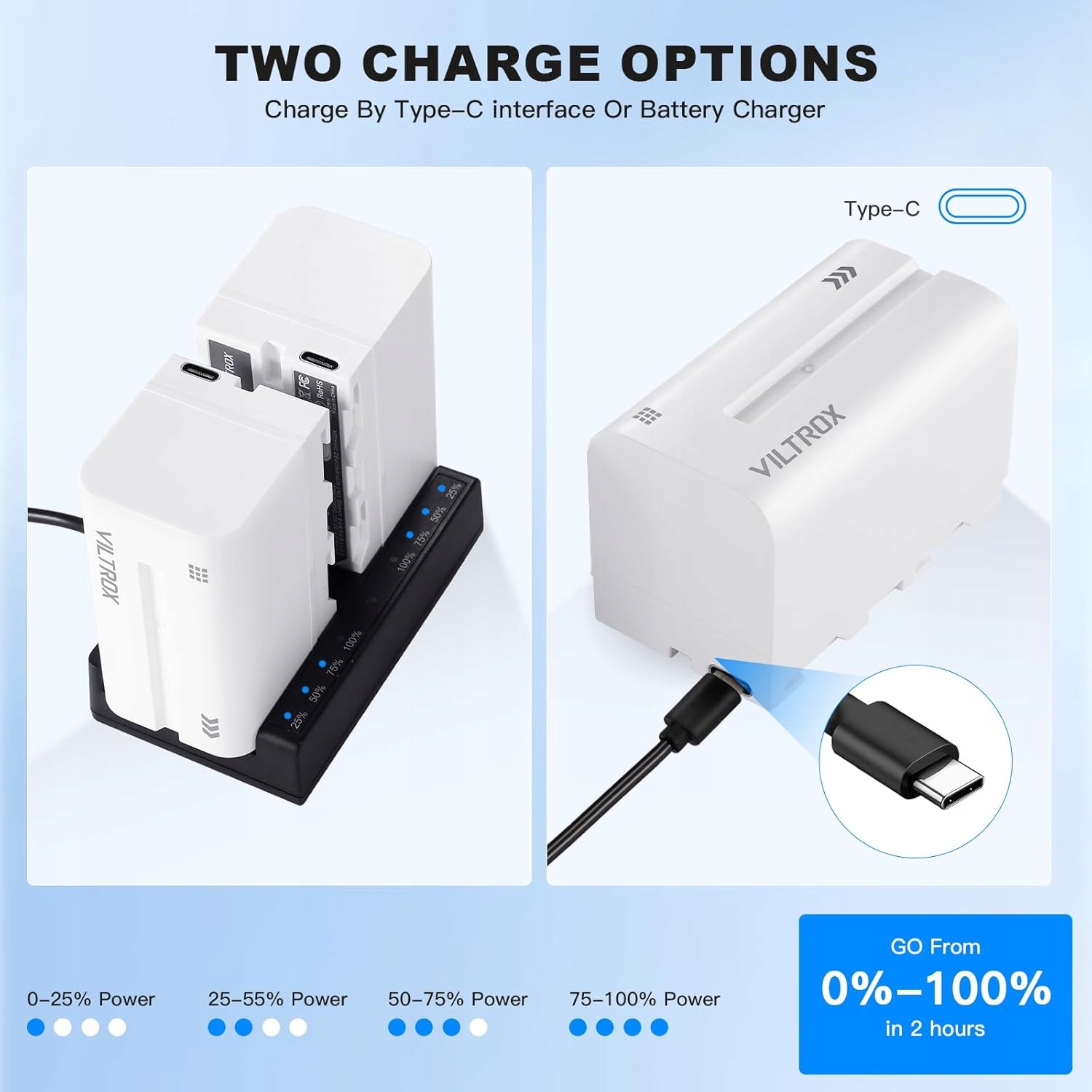 акумулятор Viltrox NP-F750 Замінна батарея 2 батареї та розумний світлодіодний подвійний USB-C Sony зарядний пристрій NP-F970 F960 F950 F770 F750 F570 F550, сумісний з Godox Viltrox Neewer