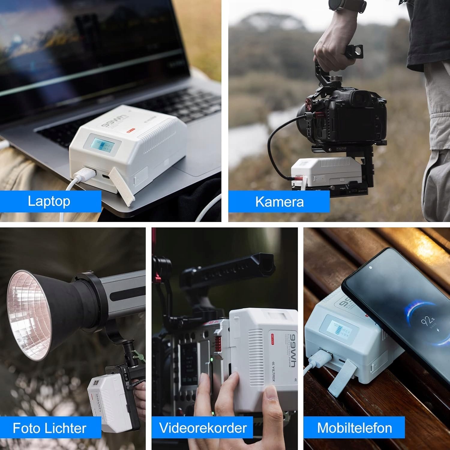 - Кілька інтерфейсів: тримач Mini V оснащений двонаправленим інтерфейсом Typec-C, підтримує вхід або вихід PD45W, 20 В/2,25 А, 5 В/9 В/12 В 3 А, оснащений інтерфейсом USB. Вихід порту BP підтримує 16,8-11 В/10 А, обидва з пилозахисною кришкою. Інтелектуальна система BMS акумулятора V Lock підтримує одночасне живлення. Один, наприклад камери, монітори, мобільні телефони, цифрові дзеркальні камери тощо.