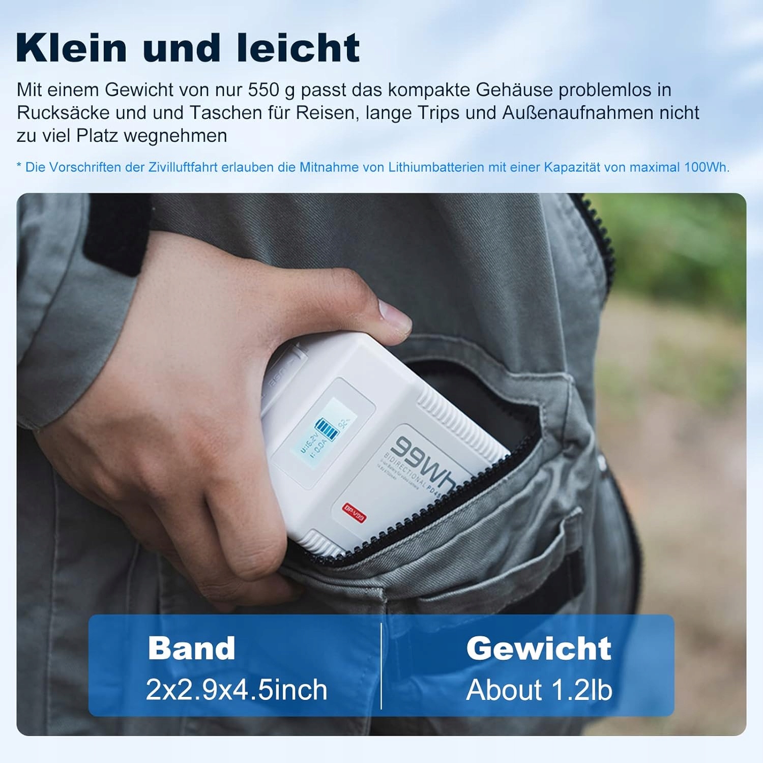 - Компактний розмір: v замок акумулятор менший за руку, вимірює лише 115 х 73 х 50 мм і важить лише 550 грам, що на 30 відсотків менше, ніж звичайні моделі, тому ви можете легко взяти його з собою. Він узгоджується з міжнародними авіаційними стандартами і його можна взяти на борту літаків. Акумулятор V-Mount стає справді портативним мобільним джерелом живлення для зовнішнього використання, завдяки якому ви можете використовувати мобільний телефон. Відеокамера та відеокамера, що заряджає монітор.