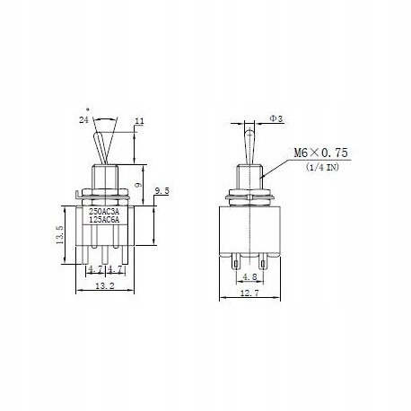 Навантажувальна здатність контакту: 3 A 250 В/6 A 125 В - Опір контакту: макс. 20 м. - Опір ізоляції: 500 В постійного струму 100 м - Електрична міцність: 1500 В змінного струму/1 хвилина - Діапазон робочих температур: -25~+85°C - Термін служби: 10 000 циклів - Кількість контактів: 6 - Кількість позицій: 2 - Тип: подвійний/для пайка проводів