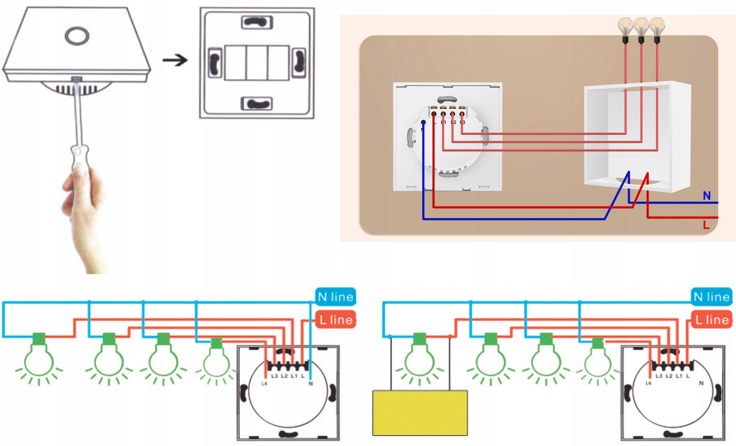 Вимикач із підсвічуванням сигналізує про ввімкнення та вимкнення світла за допомогою кольорів. Бездротове управління через домашню WiFi мережу або сенсорне керування. Для усунення перешкод лампової напруги використовується конденсатор. Інакше світло може мерехтіти.