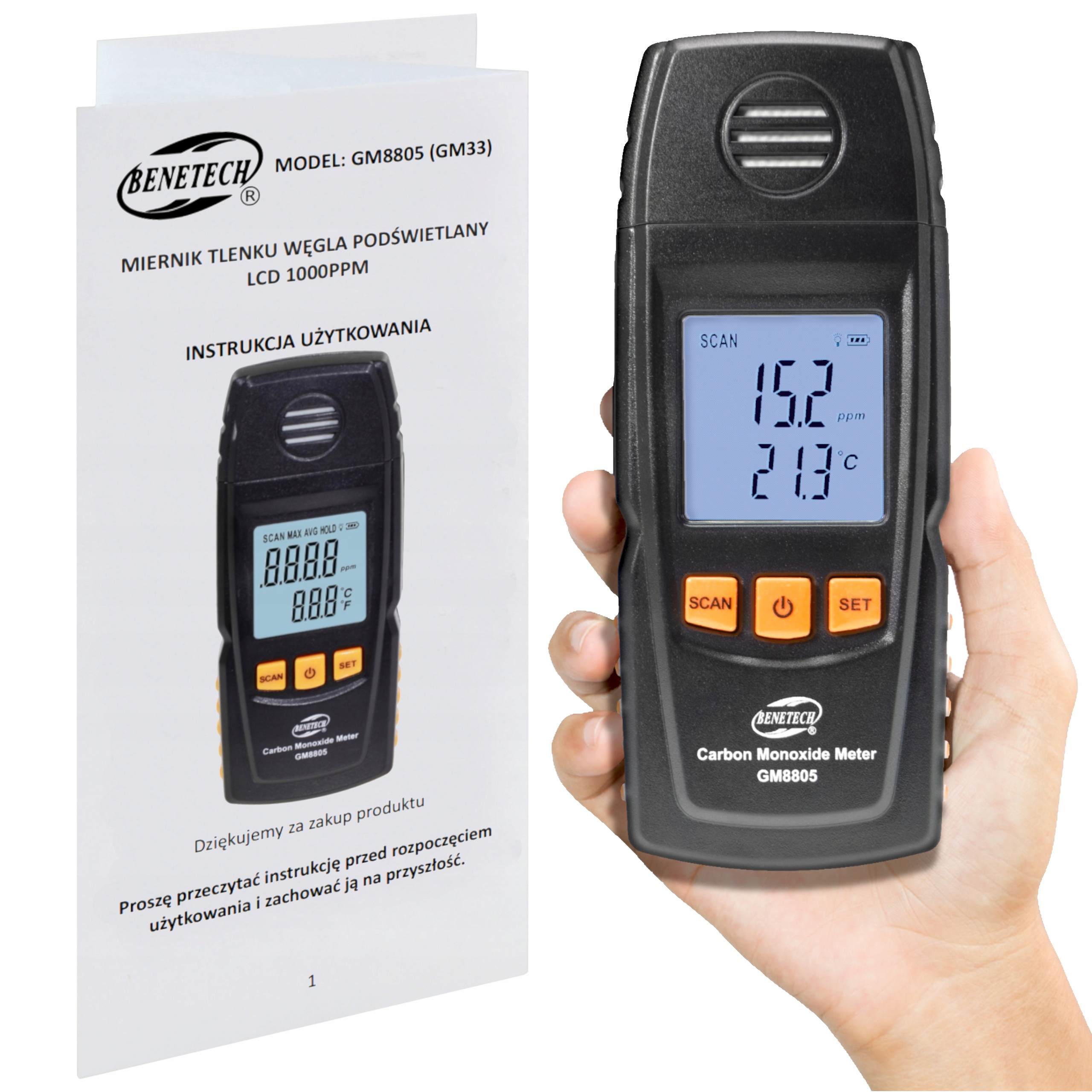 Великий РК-екран з підсвічуванням показує найнеобхіднішу інформацію, таку як концентрація чадного газу, рівень енергії пристрою та температура.
