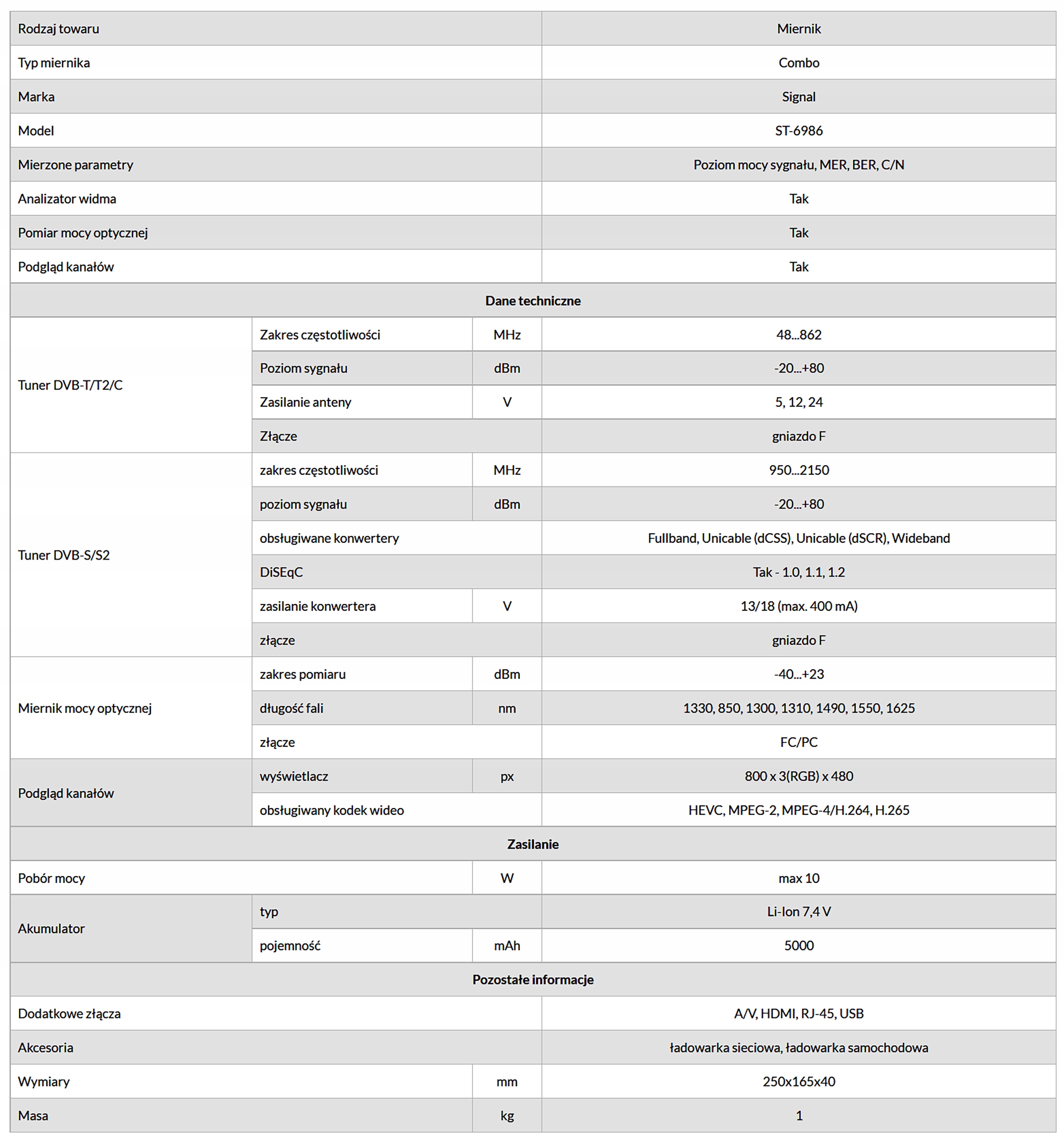 Він має 7-дюймовий кольоровий РК-дисплей TFT. Ідеально підходить для запуску будь-якої інсталяції ТБ/САТ. Він дозволяє налаштувати будь-яку антену наземного та супутникового телебачення, налаштувати фільтри, вибрати підсилювачі і т. д. Вимірювач має вбудований тюнер, що забезпечує постійний попередній перегляд заданого каналу, і аналізатор розподілу спектру.Попередній перегляд каналів на екрані та інтуїтивно зрозуміле управління гарантують швидке виконання кожної установки.
