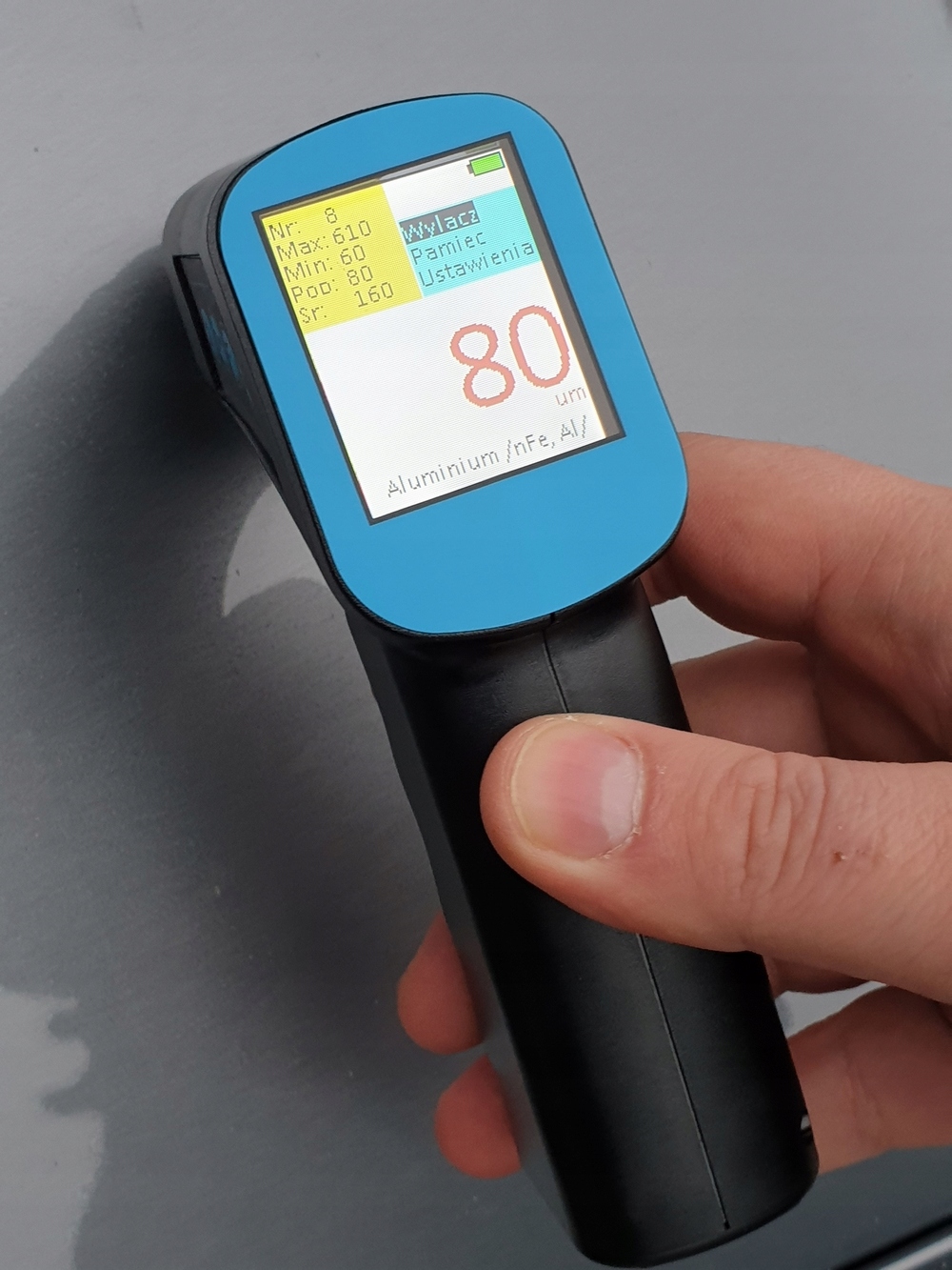 Вимірювання товщини фарби на автомобільній сталі, оцинкованій сталі та алюмінієвому листі. Виявлення цинку на сталі. Помічник вимірювання. Сферичний зонд - вимірювання на кривих. Корпус пістолета.