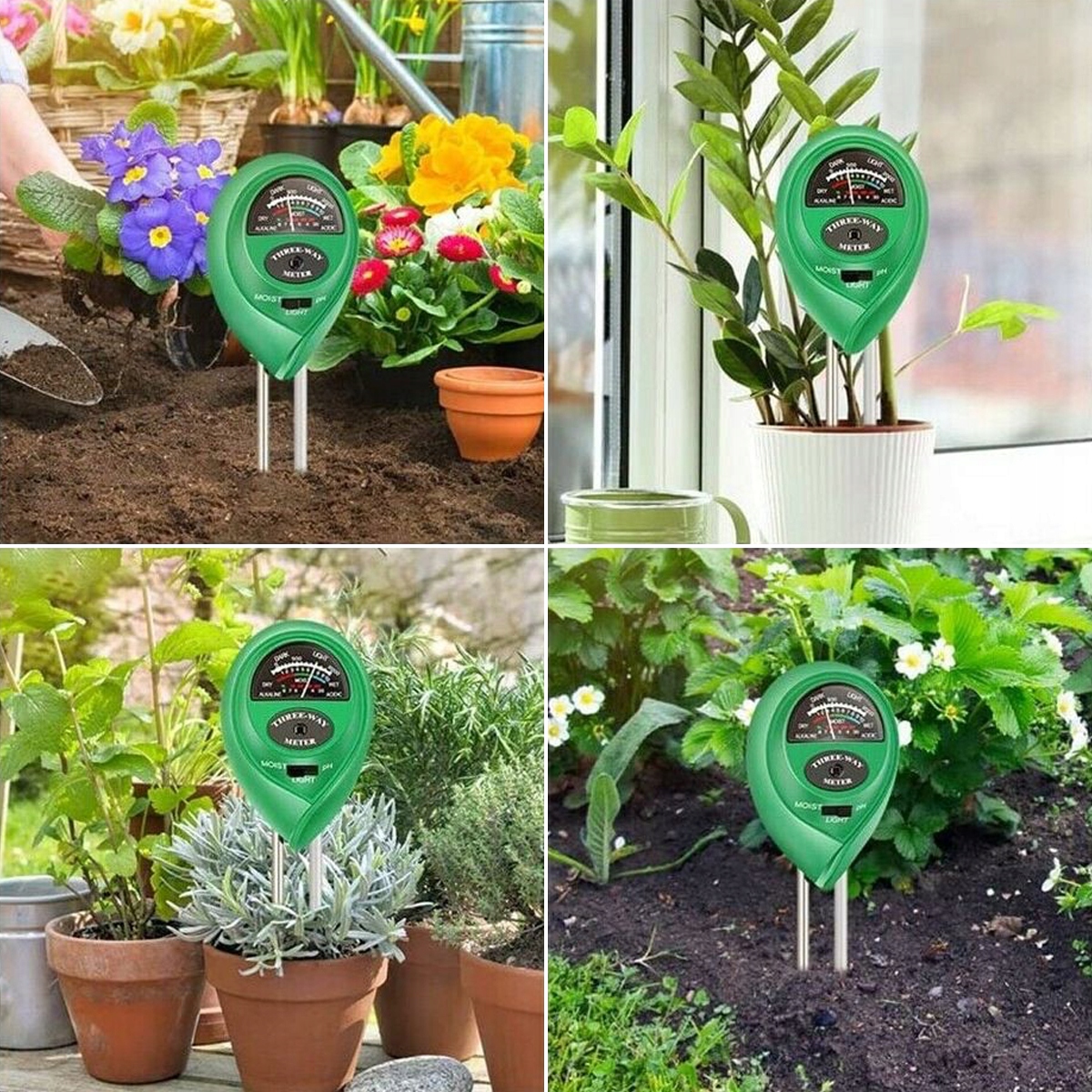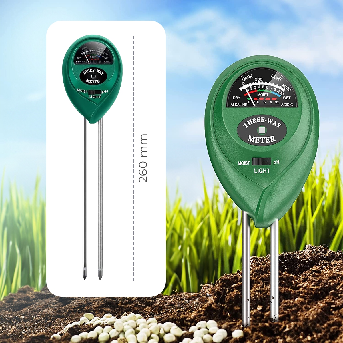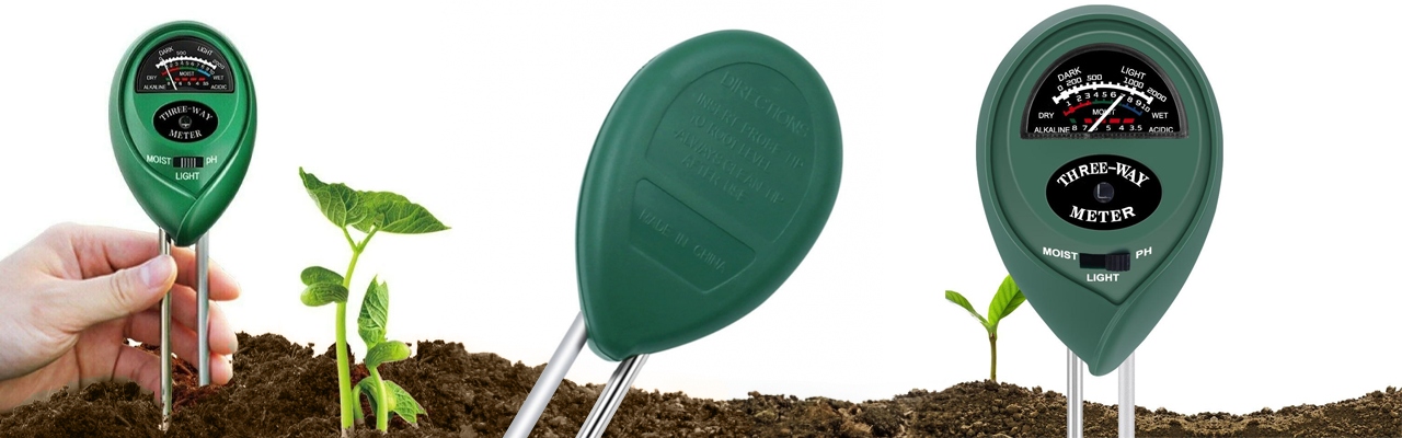 - 3in1 – кислотомір дозволяє зчитувати вологість, pH і сонячне світло. На виробі є перемикач, який дозволяє зручно перемикати тип вимірювання.