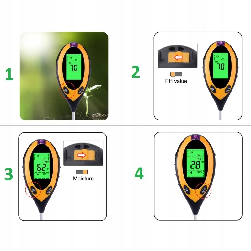 4 в 1 – кислотомір має 4 показникивологості, pH, температури ґрунту та сонячного світла.