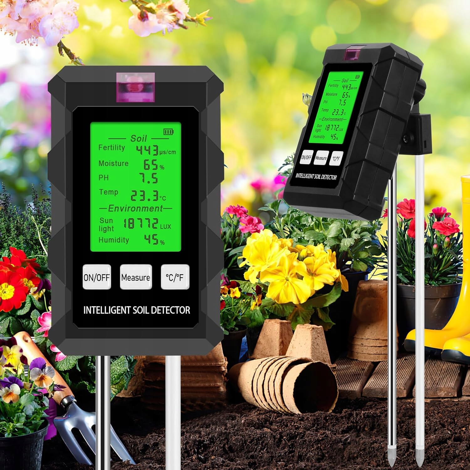 🌱🌱 Багатофункціональний тестер ґрунту 6-в-1: Цей інструмент допомагає контролювати шість факторів, важливих для росту рослин: вологість, pH, температура, родючість, інтенсивність світла та вологість навколишнього середовища. Надає точні дані в реальному часі, що ідеально підходить для садівників і фермерів. Цей продукт призначений для глини та ґрунту, але не для порошків, каменів, органічних матеріалів або рідин. Не підходить для сукулентів/орхідей.