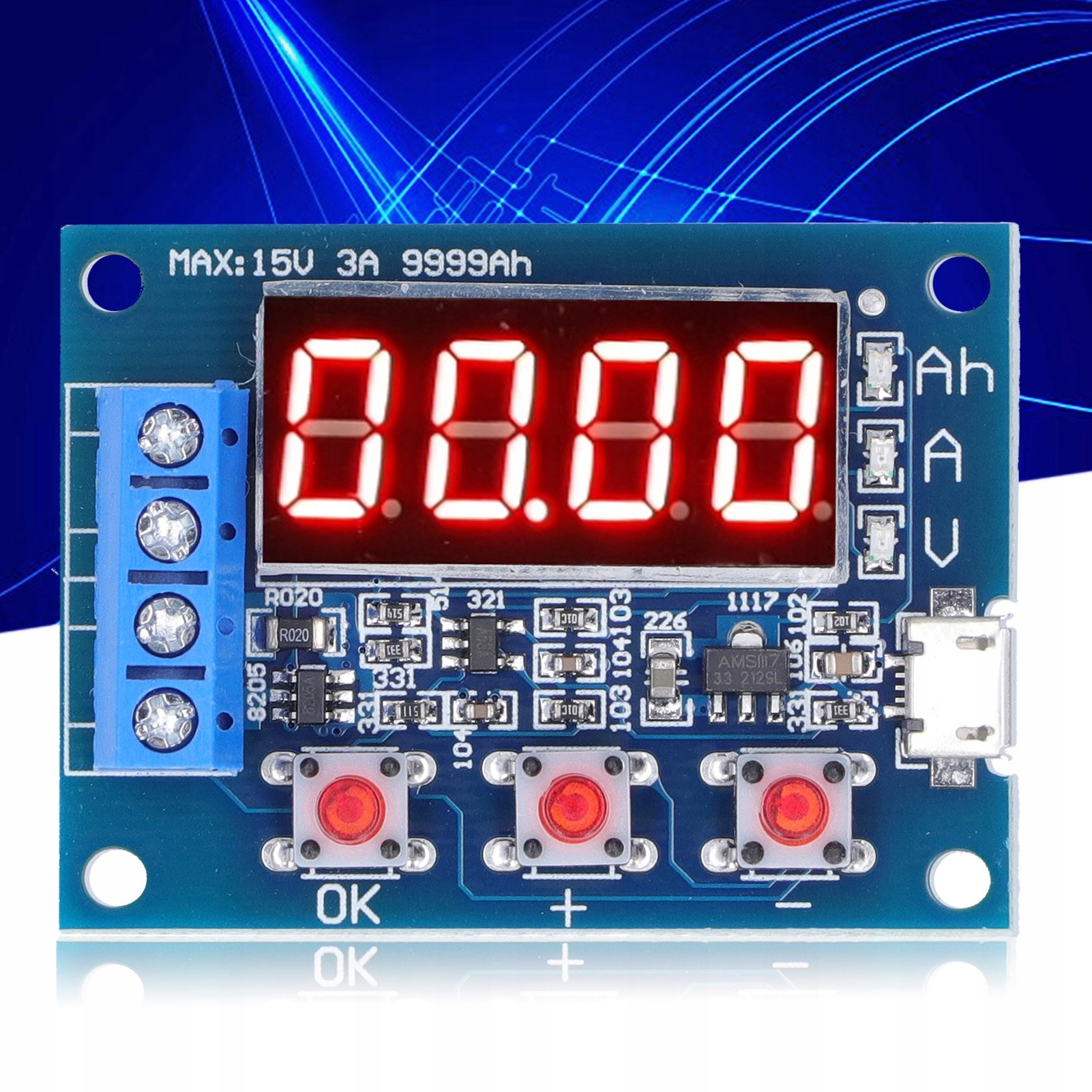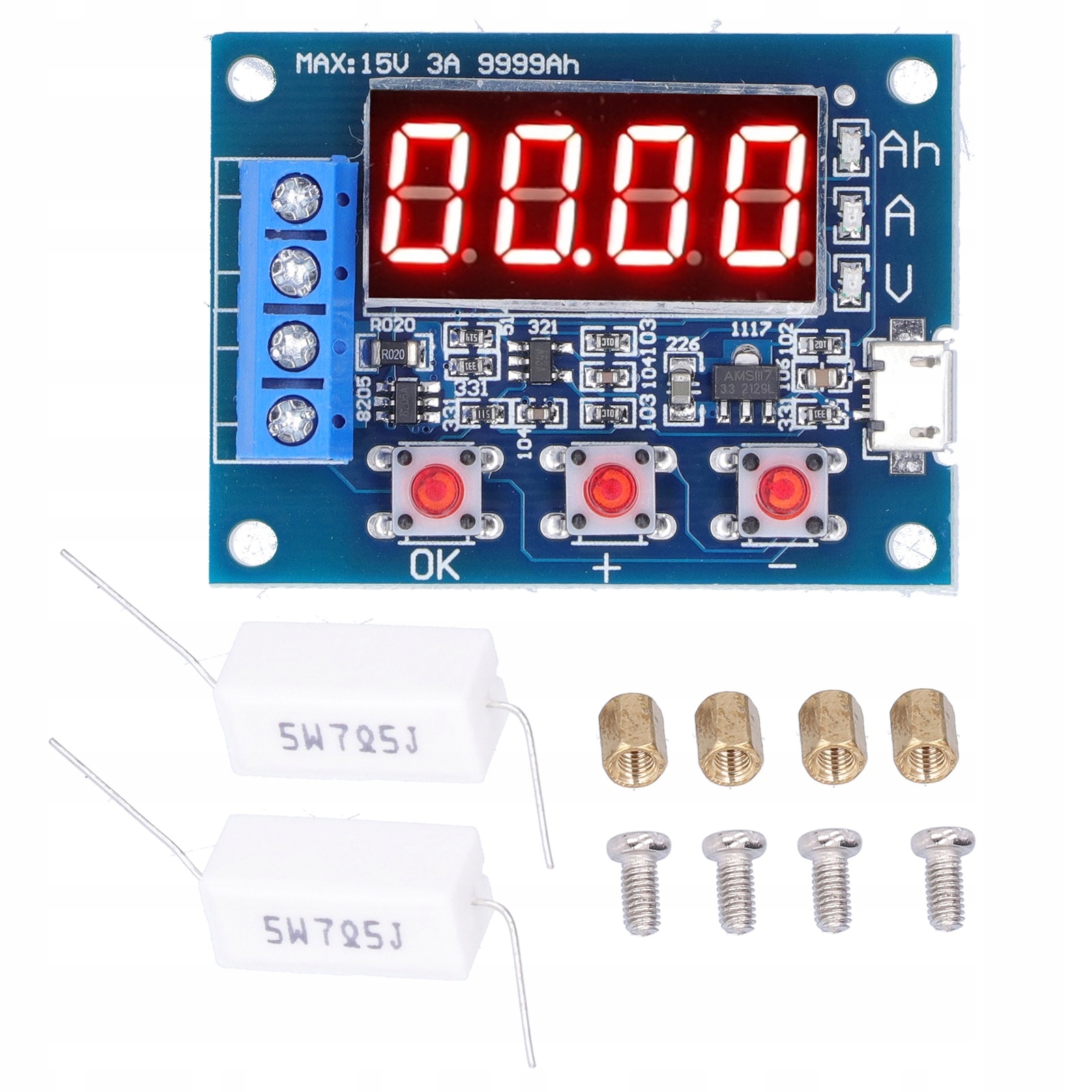 Діапазон максимальної ємності акумулятора: 9999Ah (1Ah=1000mAh). Коли значення велике, десяткова крапка переміщується для перемикання, коли воно менше 10Ah, воно відображається як X.XXX, коли досягає 10Ah або більше, він відображається як XX.XX тощо.