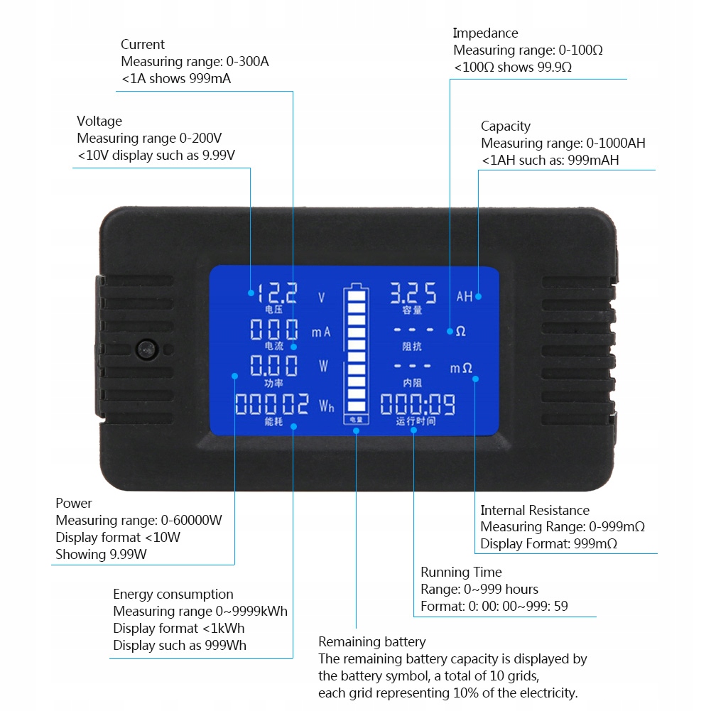 Функція: 1. Тестер акумулятора відстійне до вимірювальної напруги, дезінтеграції, потужності розриву, опору, внутрішнього опору, потужності, живлення, що залишається, енергоспоживання та робочого часу різних типів батарей та відображення вимірювальних даних на РК -дисплеї.