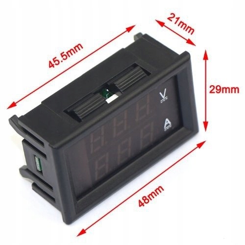 Універсальний панельний вимірювальний прилад, цифровий вольтметр та амперметр із вбудованим шунтом у корпусі. Зручний спосіб зробити свій лічильник у своєму пристрої. Версія з червоним вольтметром і синім амперметром.