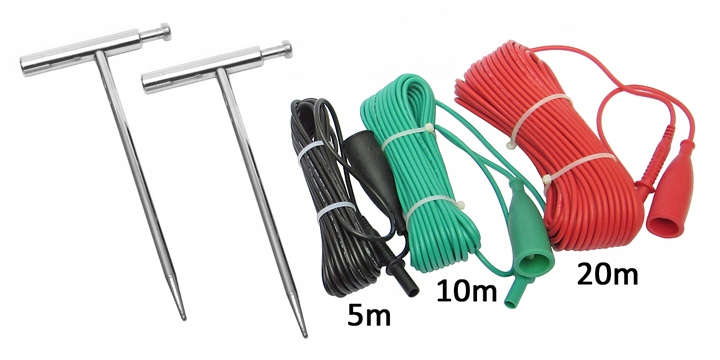 Увага! Стандарт EN 60364-6-61 для установок низької напруги стверджує, що відстані між заземлюючим електродом і одним із зондів і зондами однакові. Лічильник постачається з двома вимірювальними штифтами та кабелями довжиною 20 м, 10 м і 5 м, які забезпечують довжину між електродом заземлення та зондами до 15 м. Ці довжини є достатніми для проведення вимірювань без будь-якої взаємодії між електродом заземлення та електродами.