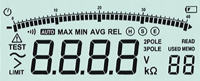 Лічильник має великий (36x95 мм) РК-дисплей із підсвічуванням із 3¾ цифрами для зчитування результатів вимірювання, 42-сегментну гістограму (лінійка, що полегшує оцінку показань – еквівалент покажчика в аналогових лічильниках), MAX/MIN Функція /AVG для відображення мінімального, максимального та середнього значення, режим відносного вимірювання, внутрішня пам'ять для зберігання 100 вимірювань і автоматичне відключення (після 15 хвилин бездіяльності).