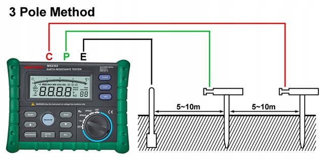 - вимірювання опору заземлення за допомогою триполюсного методу (3-полюсний метод)