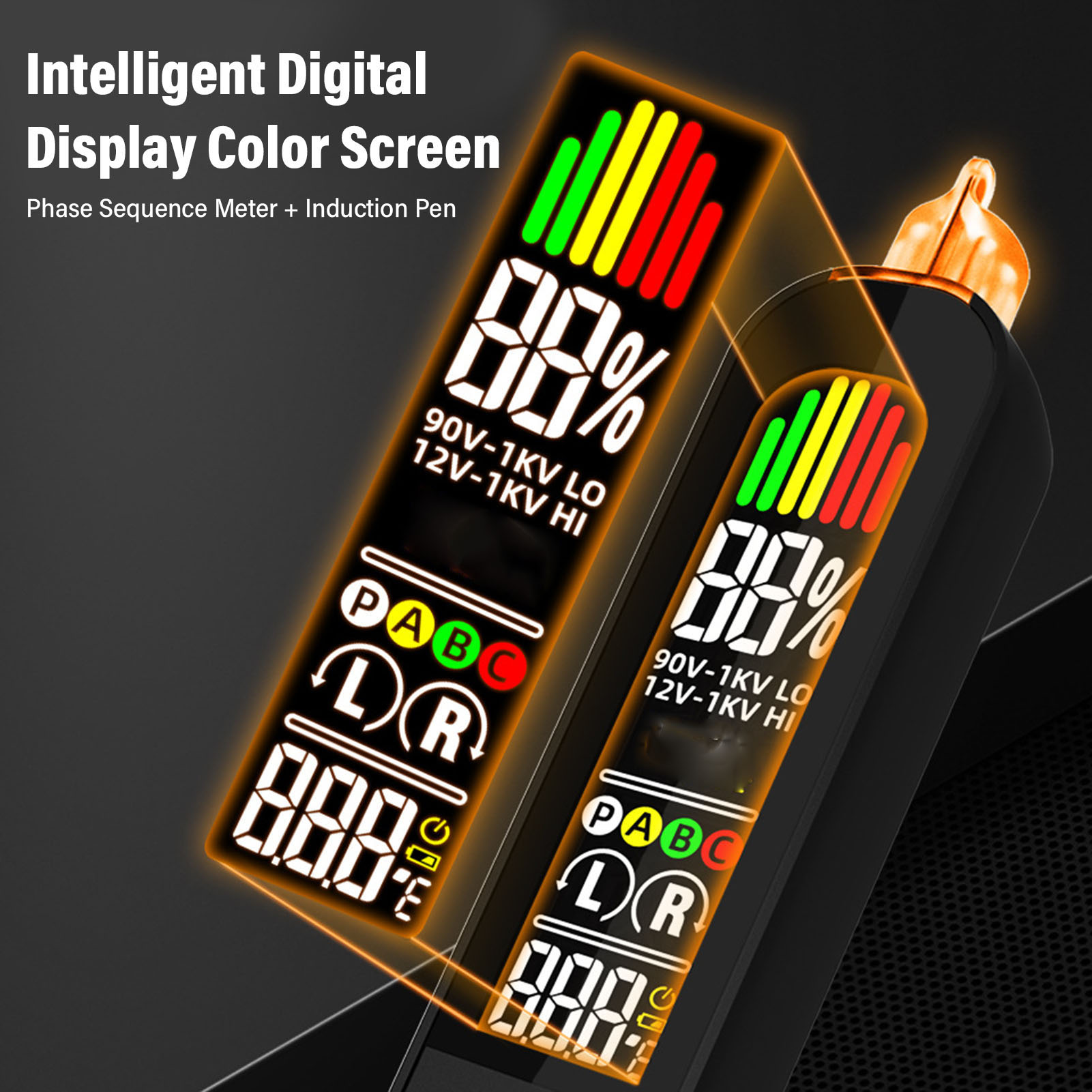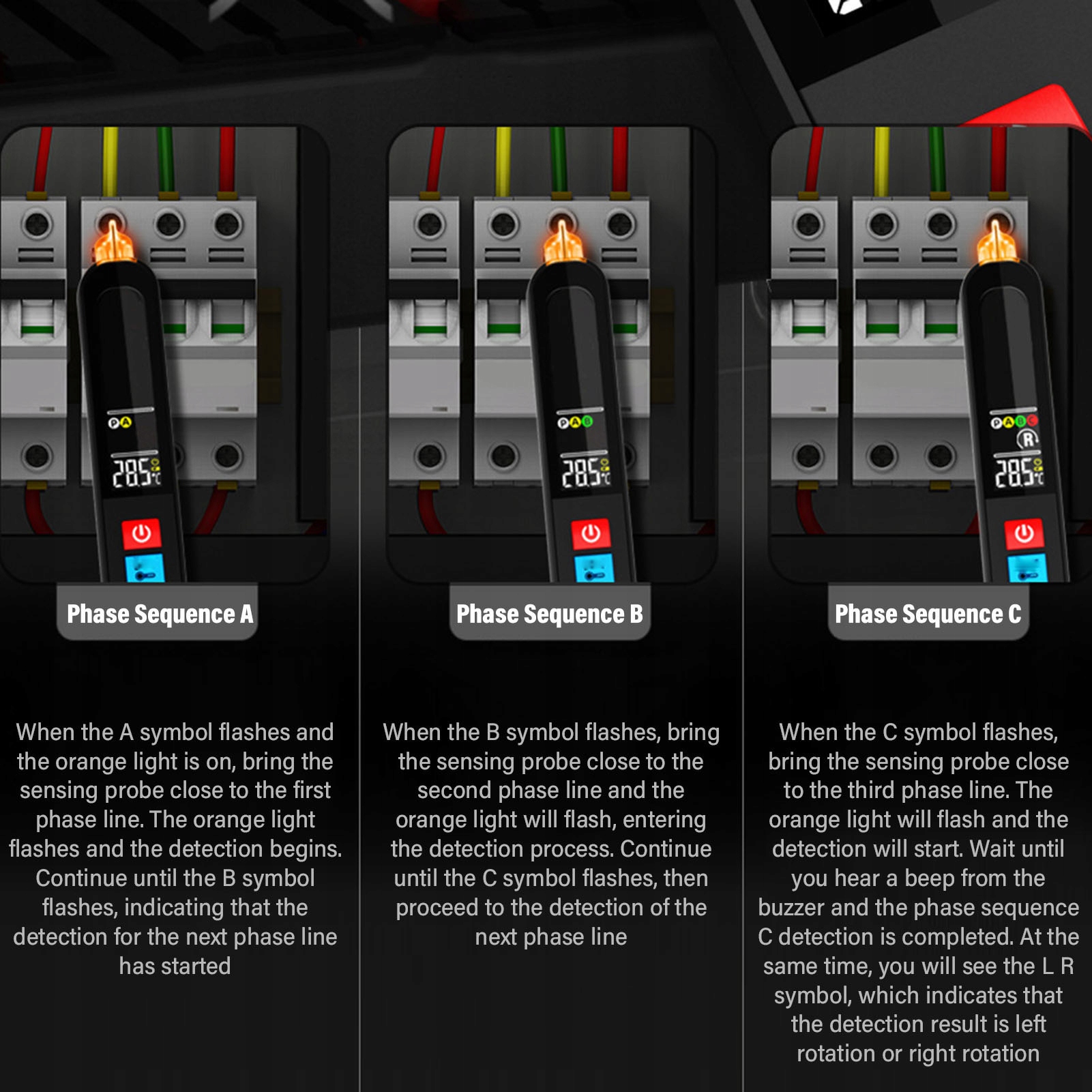 1. [3-фазний тестер обертання] Безконтактний тестер напруги містить 3-фазний вимірювач обертання, який чітко показує поворот L вліво або R вправо, що спрощує перевірку електричної фази під час усунення несправностей