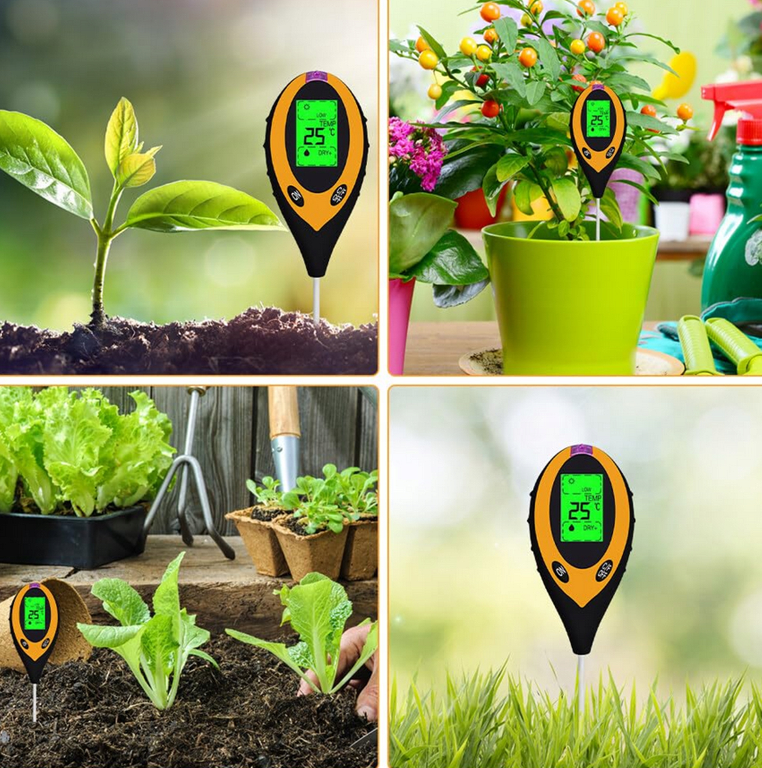 Представляємо наш вимірювач ґрунту 4 в 1. Його функції дуже різноманітні, він може вимірювати вологість ґрунту, температуру, pH ґрунту та інтенсивність сонячного світла. Це найкращий інструмент для моніторингу здоров’я та росту рослин.