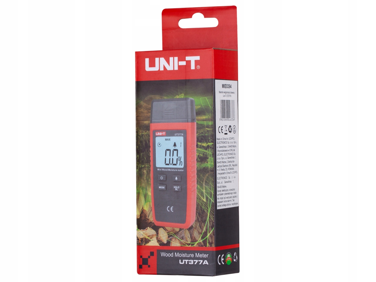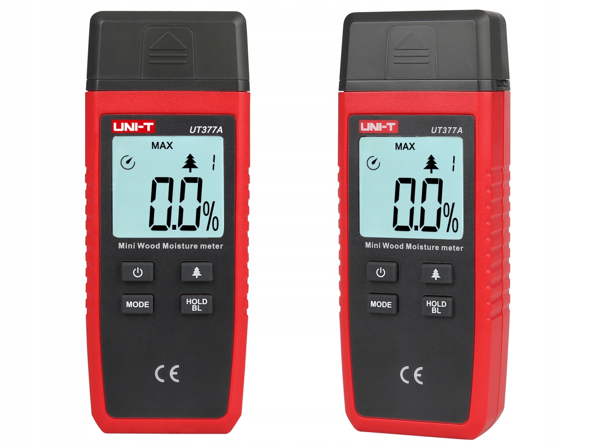 UT377A — цифровий вимірювач рівня вологості деревини, паперу, фанери та інших дерев’яних матеріалів. Прилад вимірює рівень вологості на основі щільності різних порід деревини, розділених на чотири категорії, враховуючи вплив температури на точність вимірювань.