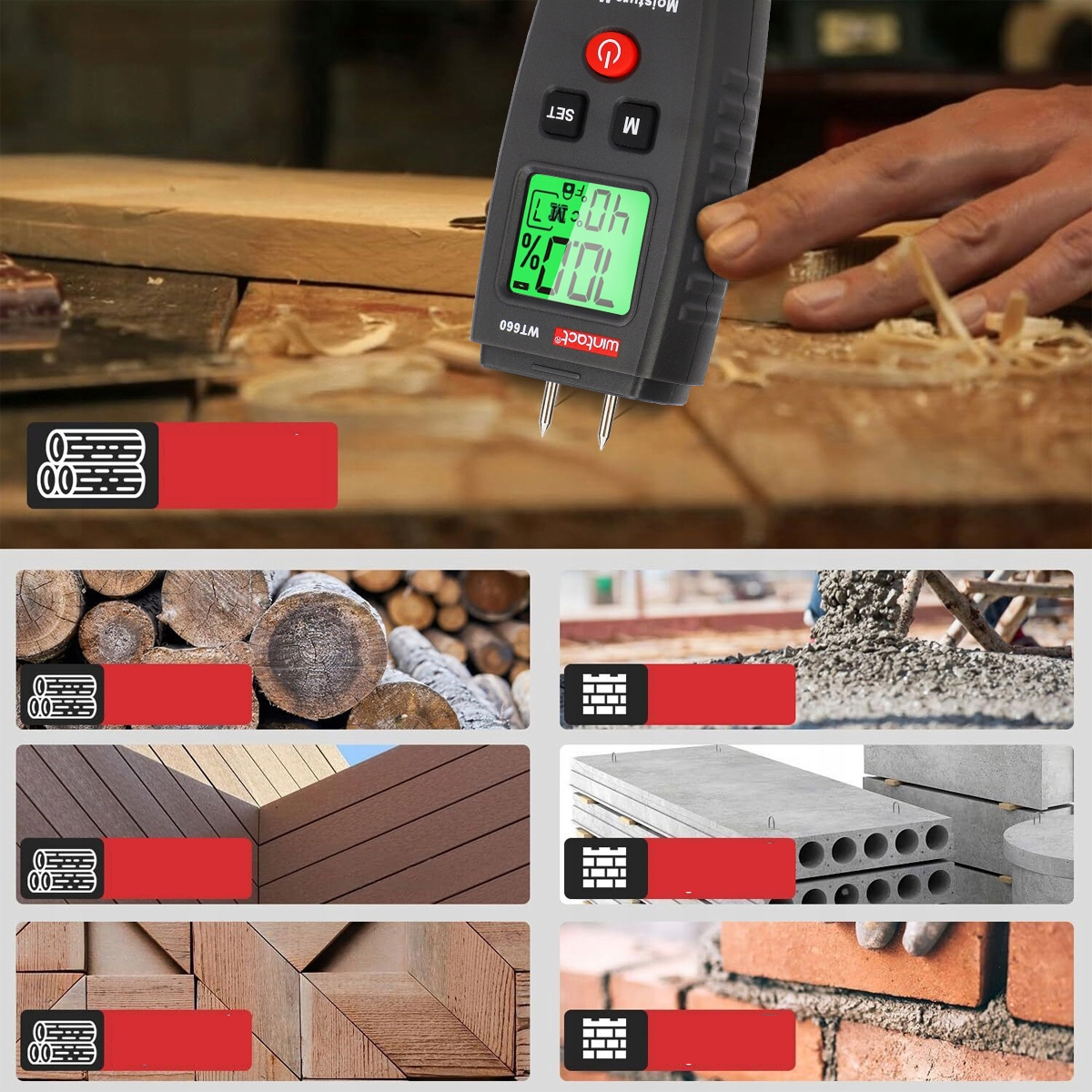 Пристрій для вимірювання вологості WT660, вологомір для дерев’яних стін, вологомір із зеленим РК-дисплеєм із підсвічуванням