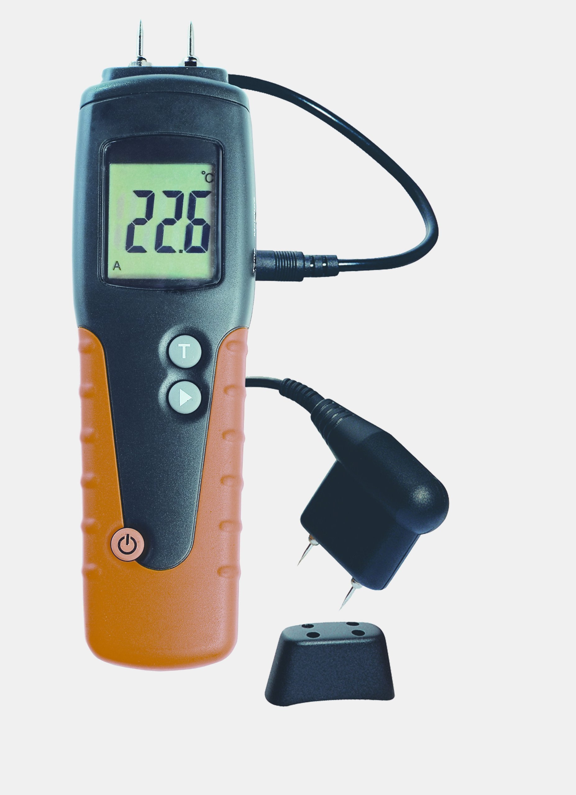 - Вологомір: для перевірки на місці будівництва або у випадку нових будівель, для вимірювання вмісту вологи в дровах або будівельних матеріалах