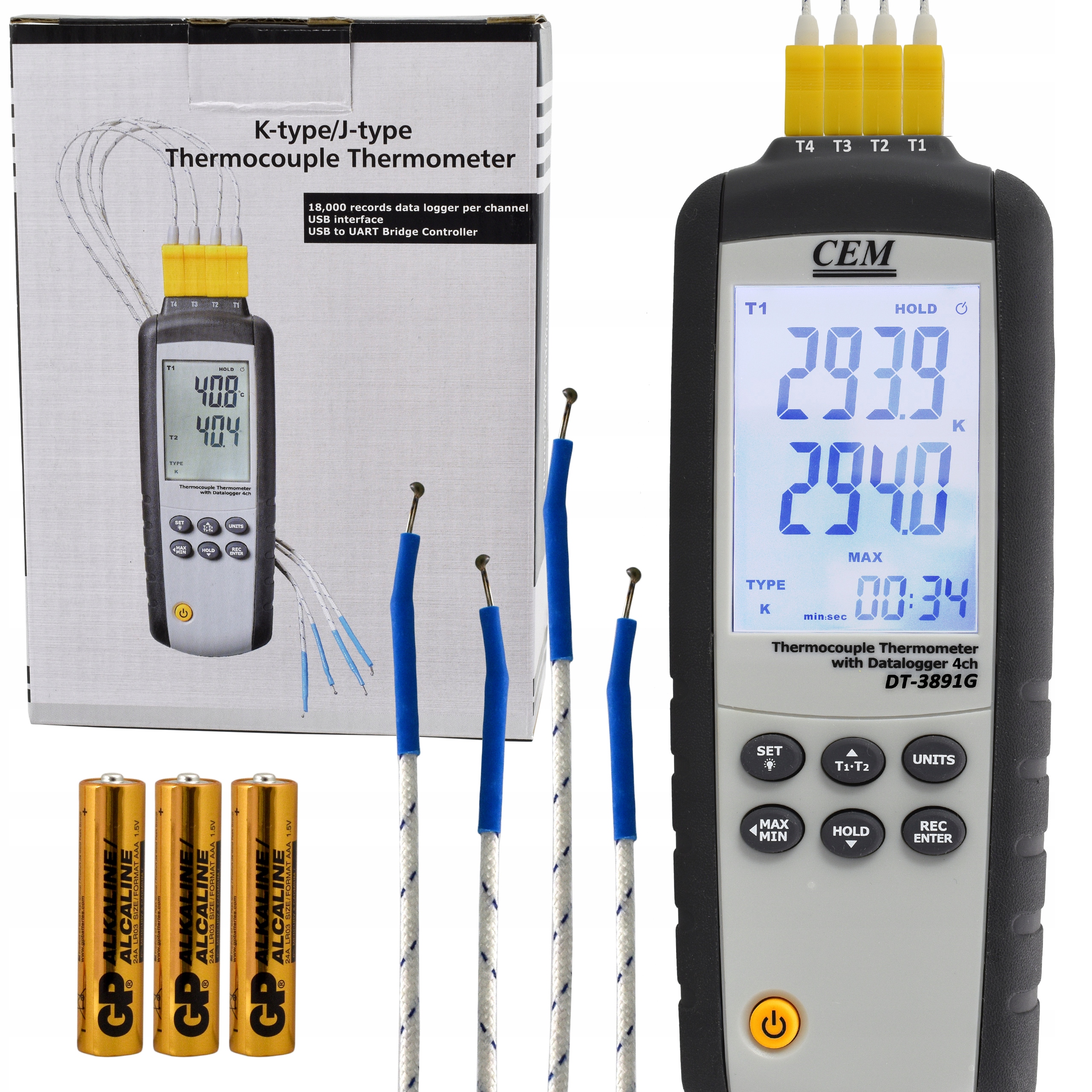 - Стандартне обладнання: 4x K-type temperature кульковий зонд (вимірювання температури повітря) DT-3891G, USB-кабель, компакт-диск із програмним забезпеченням