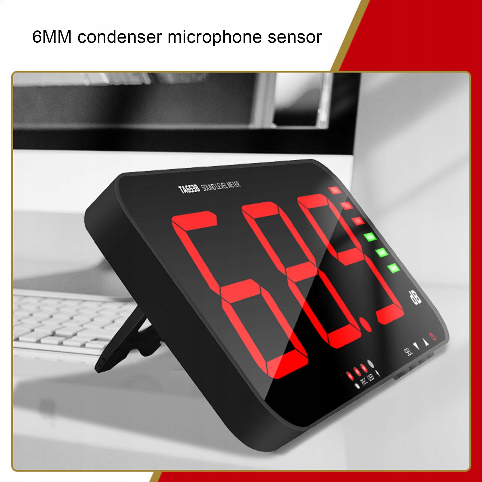 4. З зумер: лічильник децибелів з верхнім моніторами, що нагадує межу, може встановити верхній поріг нагадування про кордон; Коли вимірювання вище, ніж встановлений поріг, зумер видасть попереджувальний звук, а попереджувальне світло - мігрування; Значення становить від 6 до 120 -х