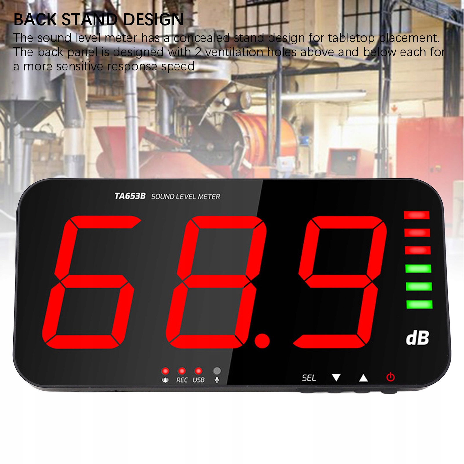 3. Проектування підставки ззаду: звуковий рівень вимірювача має приховану структуру таблиці. Задня панель була розроблена з двома отворами вентиляції вгорі та внизу, для більш чутливої швидкості реакції