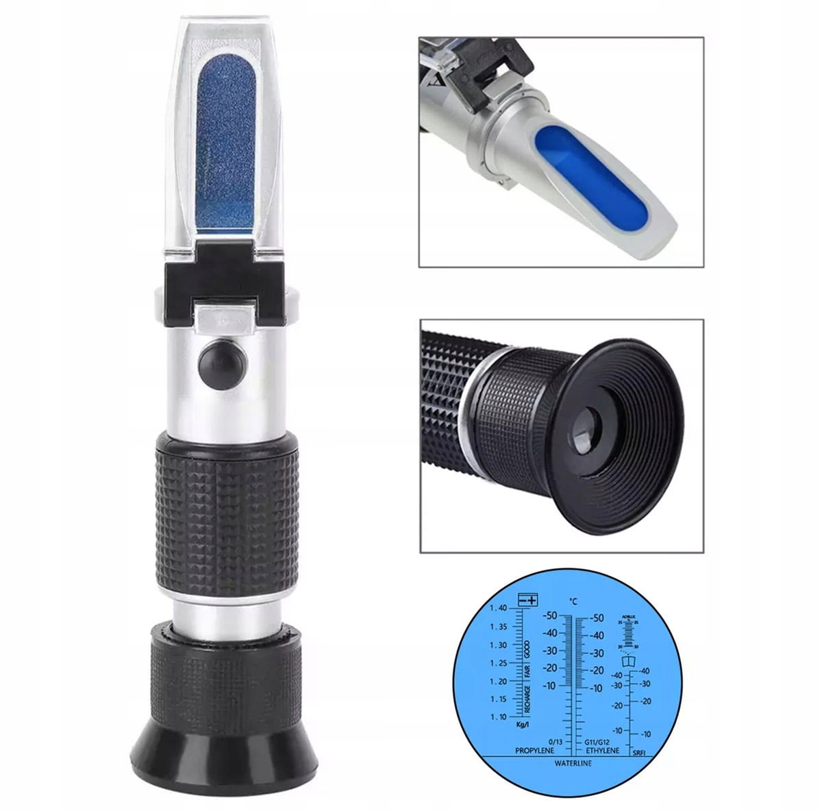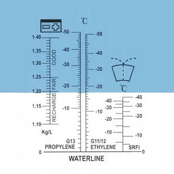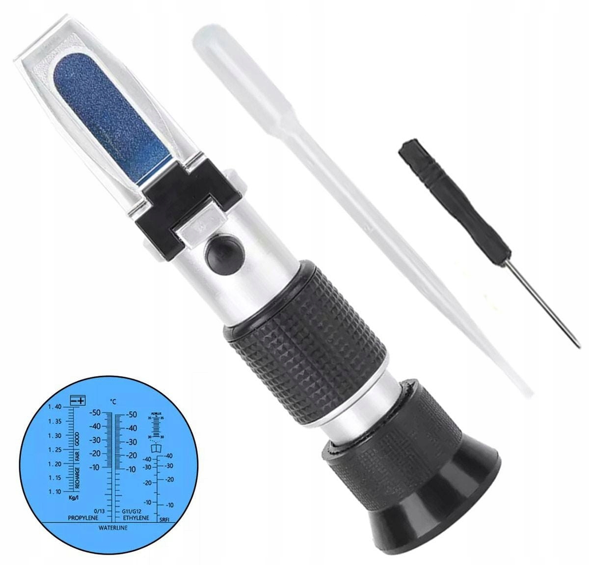 Компактний оптичний тестер автомобільних робочих рідин. Він дозволяє миттєво вимірювати вміст електроліту в акумуляторі та температуру замерзання охолоджуючих рідин і рідин на основі гліколю. Просто візьміть зразок рідини піпеткою, помістіть зразок на панель керування рефрактометра та прочитайте показання за допомогою видошукача.