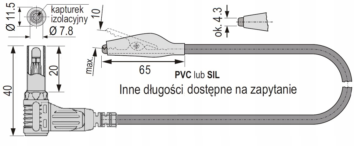 - Конструкція: кутовий банановий штекер ø4 мм - ізольований крокодиловий затиск