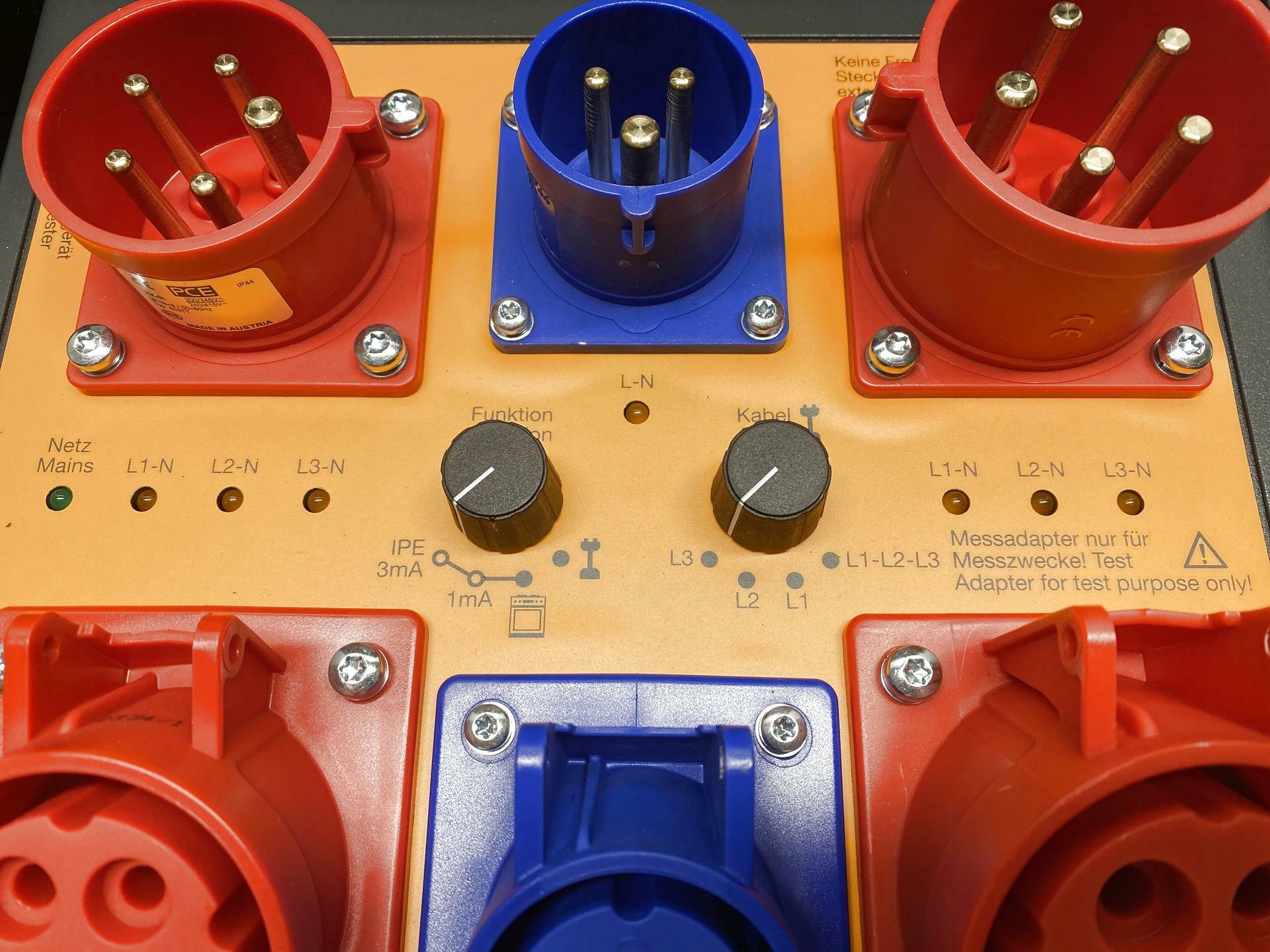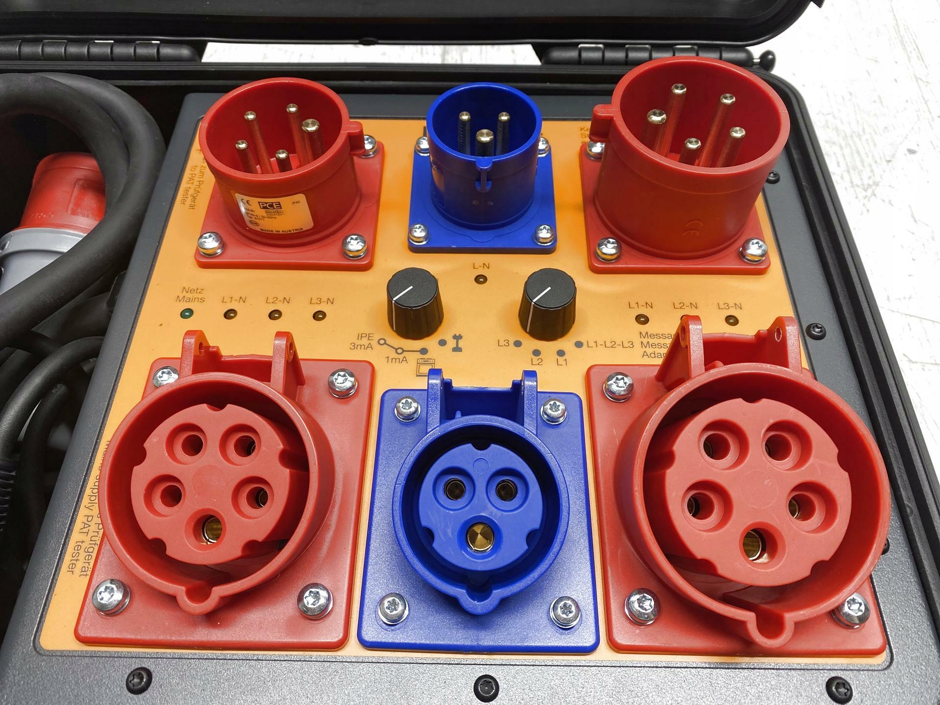 Залежно від типу тесту, також можуть бути доступні розетки CEE 16A або 32A. In the case of CEE 16A, an adapter cable is required
