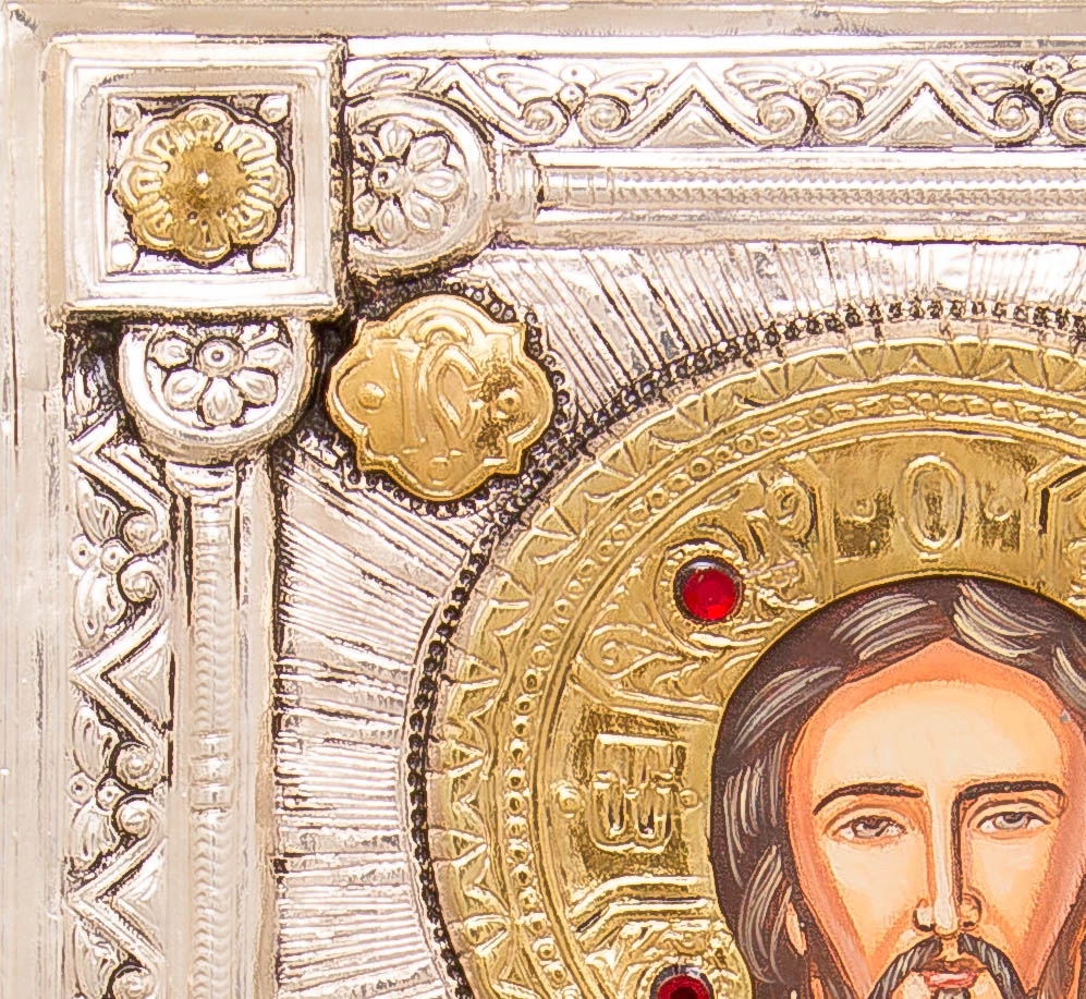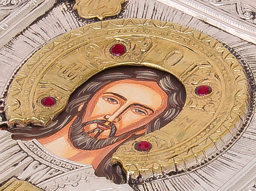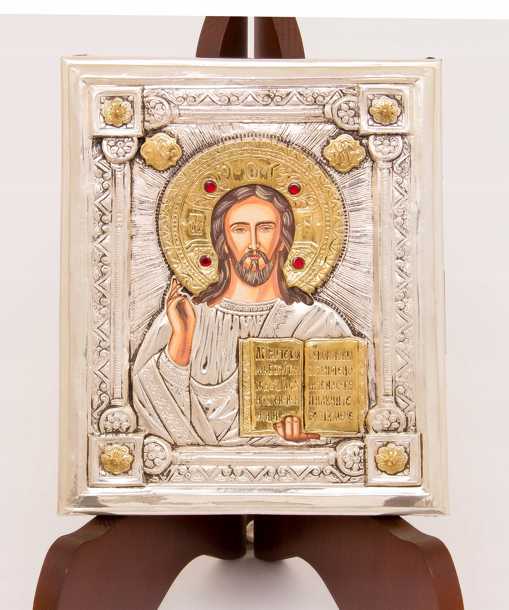 Іконографічне зображення Пантократора широко поширилося, починаючи з 4-6 ст. Як Пантократор, Христос зображений стоячим або сидячим на троні, з відкритим Святим Письмом у лівій руці та піднятою правою рукою в жесті благословення. Положення пальців вказує на грецьку монограму Христа: IC XC. З'єднані два пальці: великий і безіменний. Завдяки цьому вказівний і середній пальці нагадують літери IC. Схрещені великий і безіменний пальці по діагоналі разом із мізинцем утворюють на оригінальному зображенні. Вирізані частини металу розкривають малюнок, щоб додати шарму іконі своїми кольорами. Ручний розпис. Лазеризована олія на акриловій основі. Шар глазурі надає картині глибини та «старого» враження, де кольори виглядають «потемнілими від диму свічки». Одночасно є захисним шаром фарбування. Акрилова основа є чудовою кольоровою основою для проявлення та обробки олійними фарбами.