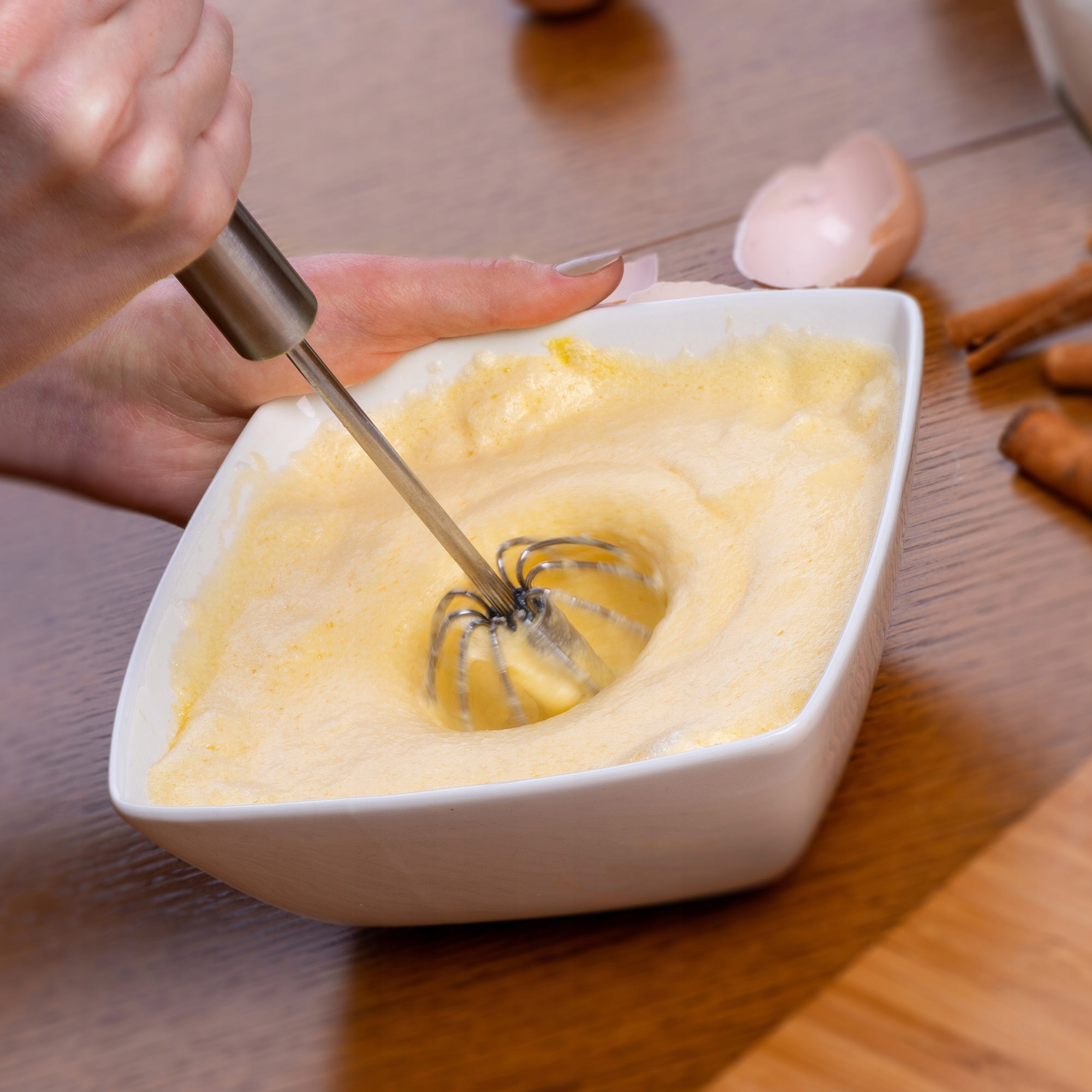 Функціональний роторний збивач, який є другом кожної господині при збиванні яєць, змішуванні яєчних білків, супів, соусів. Продукт простий у використанні, просто рухайте ручкою вгору-вниз і перемішуйте миттєво.