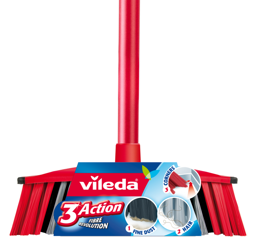 Щітка Vileda 3 Action виготовлена за технологією AFT, що робить її дуже легкою. Має три кольори щетини. Чорний використовується для збору волосся і хутра, сірий відмінно змітає пил і пил, а червоний має особливий профіль, завдяки чому він дістає до важкодоступних місць, таких як кути і кути. Гумові накладки на голову захищають планки, стіни та меблі від пошкоджень. Мітла продається в комплекті з ручкою.