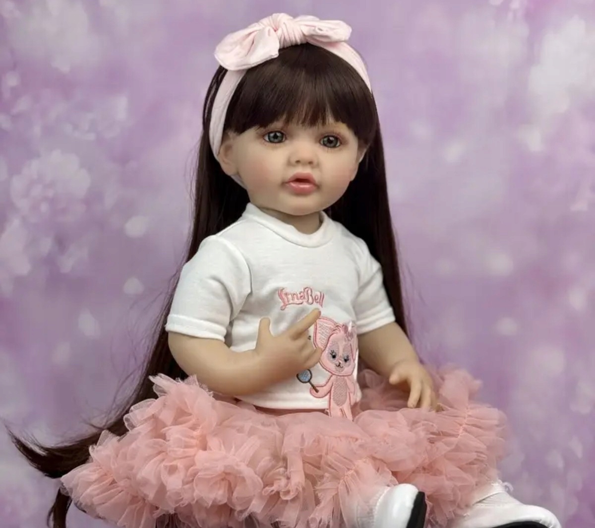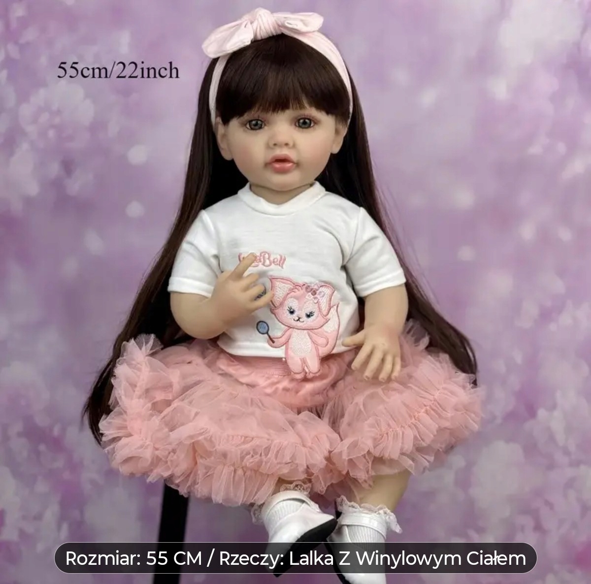 Красива, реалістична лялька розміром 55 см, виготовлена з повного вінілу та розроблена з увагою до природного вигляду - ідеальна як подарунок, частина колекції або прикраса. Лялька має довге густе волосся, деталізоване обличчя та реалістичні ручки та ніжки - вона схожа на немовля та привертає увагу своєю природною роботою.